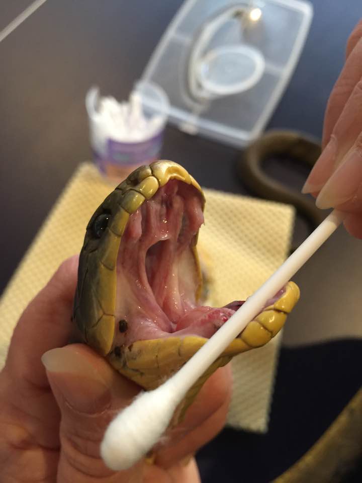 We chase each other around for a while and I eventually get him into the tube for a closer inspection of that wound. Georgie was right - he’s very underweight and I need to find out why. I slowly extract him from the tube until I can restrain his head. And I have a good look into his mouth. Hmmmm - very red, inflamed and sore. Possible stomatitis. This would certainly be a symptom of a systemic infection. After consulting with a Reptile Veterinarian, I start him on intramuscular antibiotics and wash out his mouth with an antiseptic. I give subcutaneous fluids to address his dehydration. He’s soon dozing on a lovely warm heat-mat in his temporary home.