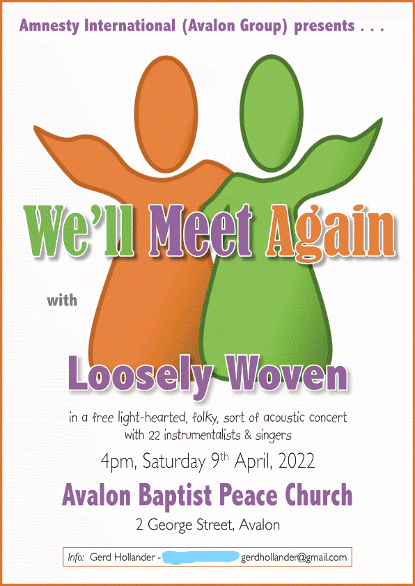On Saturday 9 April at 4:00 pm, Loosely Woven, a music group consisting of 22 instrumentalists and singers, return to Avalon for the first time in over two years with their brand-new concert, ‘We’ll Meet Again’. The group is led by Wayne Richmond, who has been a great benefactor of Amnesty, and over the years has helped raise well in excess of $20 000. The concert will be hosted by the Avalon Amnesty group at the Avalon Baptist Church at 2 George Street. Entry is free but a donation to Amnesty will be appreciated.