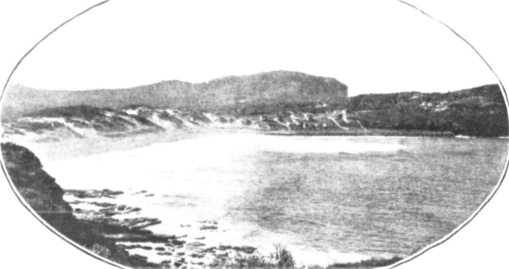 From this point the outlook south towards Manly, and northward to Barrenjoey, revealed, a chain of blue bays, some evenly scalloped, others jagged-edged, broken in one place by a ledge of indigo and reddish-brown rocks jutting in a foam-silvered peninsula, through ultramarine waters. Blue bay after blue bay, and curving beach upon curving beach of fine yellow or coarse red-gold sun-dappled sand, and grass-tufted, wind-ridged dunes. Here cerise-clawed. seabirds paddled .through lambent amber and almond green ripples on the ocean brink. They pressed wave-powdered shells in intricate, marquetry into the shining strand, which the rising tide .would laughingly sweep away to pave 'hidden' paths, deep down in measureless' marine gardens, where Leviathan looms with swordfish and shark, above rotting Chinese junks, a nu sunken galleons from sun-kissed Spain.