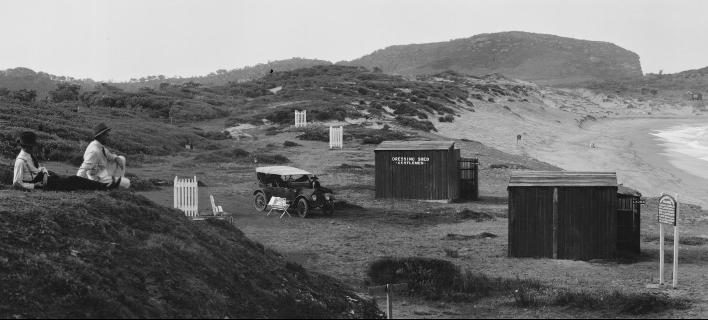 'Panorama of beachgoers at Avalon Beach', New South Wales, ca. 1925 section enlarged to show dressing sheds on Avalon Beach at this point in time. The beginnings of Norfolk Pines, planted by A J Small are in the white wicker tree guards. Image No.: nla.pic-vn6217968 by EB Studios, part of the Enemark collection of panoramic photographs, courtesy National Library of Australia Retrieved from http://nla.gov.au/nla.obj-162503014