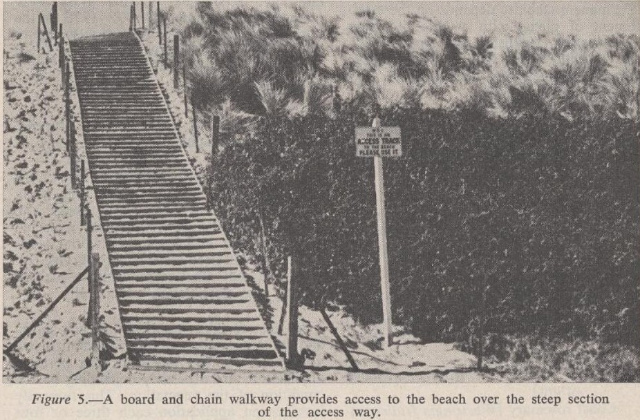 Barr, D. A. and Watt, B. G. (1969) —Pedestrian access to beaches. J. Soil. Cons. N.S.W. 25 (286-294). The Journal of the SOIL CONSERVATION SERVICE of New South Wales. APRIL, 1974, Volume 30, Number 2.