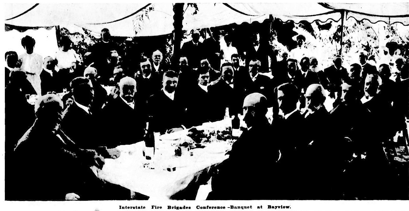 The Conference. which assembled in Sydney on May 14 was brought to a conclusion on May 19. The delegates who attended the Conference were:- Fire Brigades Board, Sydney: Messrs. Charles Bown (chairman), G. Howard Pope, H. F. Francis, E. Lindsay-Thompson, Z. Collis Barry (secretary), Alfred Webb (Superintendent of Fire Brigades), Captain E. J. Love (vice-chairman). Fire Brigades Board, Melbourne: Messrs. J. G. Aikman, M.L.C. (President), C. E. Jarrett, S. Mauger, M.P., W. Davidson, W. F. Allan. T. Sanders, D. J. Stien (chief officer), F .J. Gomm (secretary), Lieutenant-Colonel J. Ballenger, Sir H. de C. Kellett. Country Fire Brigades Board, Victoria: Captain J. Lynch (president), Mr. T. S. Marshall (chief officer). Fire Brigades Board, South Australia: Messrs. P. Heath (chairman), W. D. Ponder, M.P., W. A. Coombs, A. A. Hooker (Superintendent of Fire Brigades). Fire Brigades Board, West Australia: Messrs. Harry Brown, M.L, A. (chairman), J. M. Lapsley (superintendent). Fire Brigades Board, Brisbane, and Fire Brigades Board, South Brisbane: Mr. J. E. Hinton (superintendent). Fire Brigades Board, Hobart, Tasmania: Mr. E. P. Maher (superintendent). Fire Brigades Board, Launceston, Tasmania, Messrs. R. Bennell (superintendent), Keith Ritchie (secretary). Fire Brigades Board, Broken Hill, N.S.W. Mr. J. M. Lambourne (superintendent). Interstate Fire Brigades Conference-Banquet at Bayview. (1906, May 23).Australian Town and Country Journal (Sydney, NSW : 1870 - 1907), p. 36. Retrieved from http://nla.gov.au/nla.news-article71530695