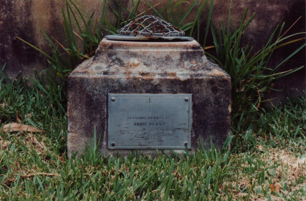 Annie died 21st July, 1942 and was buried at French's Forest Cemetery - in the Roman Catholic area, Row B/Grave 76. There is a little font with a plaque to honour her passing. I have a photo of this plaque which reads - "In Loving Memory of Annie Newey passed away 22-7-1942 aged 77 years. R.I.P."