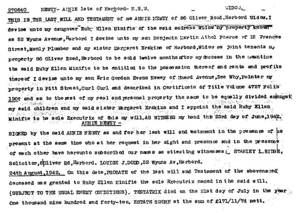 Her son Eric inherited a property in Pitt St, Curl Curl when Annie died in 1942.