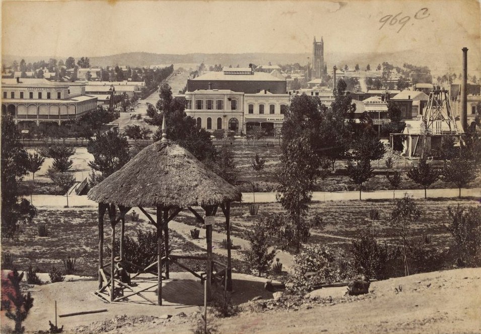 Part of Sandhurst as seen from the Camp Hill Reserve By N. J Caire 1837-1918, photographer. Date: 1876 – courtesy State Library of Victoria. Image details: Photographic print taken from Camp Hill Reserve (now Rosalind Park) looking down to township of Bendigo (then Sandhurst). Shows rotunda in foreground, poppet head (c.r.), with Shamrock Hotel and St. Paul's Cathedral visible in background. Transferred from The Victorian Patents Office to the Melbourne Public Library 1908. Link to online item: http://handle.slv.vic.gov.au/10381/55033