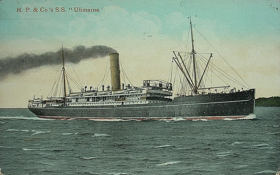 SS ULIMAROA was a 5777 ton steam ship built in 1908 by Gourlay Bros & Co at Dundee. It was registered in Melbourne and employed on the trans Tasman trade route under the owners of Huddart Parker Co. It also made a number of passages along the Australian coast.