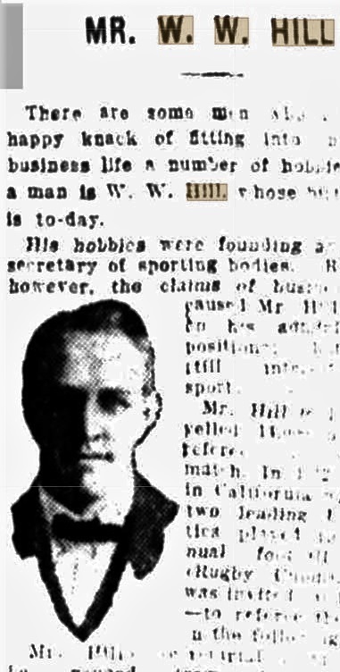 When Mr. Hill resigned from the Rugby Union the Herald published some details of his career more particularly as a footballer. In 1910 Mr Hill was recognised as the best forward in the State. Although a tall heavy man had weight did not detract from his brilliancy In the open. During his 12 years as secretary he organised tours to and from all the Rugby countries including those of the famous Wallabies to England, France and America; the ''Waratahs'' to America and the big International carnival held in Sydney In 1910.