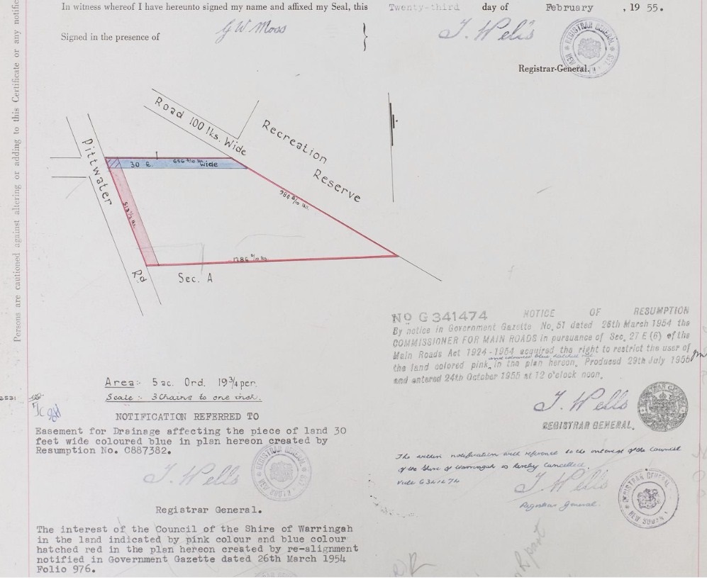 All that piece or parcel of land containing 2 acres 1 rood 37 perches or thereabouts in the Shire of Warringah, parish of Narrabeen, county of Cumberland and State of New South Wales, being part of lot 4 on Miscellaneous Plan of Subdivision (Old System), Registered Number 8,037 and being part of the land in Certificate of Title, volume 6,797, folio 222: Commencing at a point on a south-eastern boundary of lot 4 on Miscellaneous Plan of Subdivision (Old System), Registered Number 8,037 which point bears 219 degrees 8 minutes 40 seconds 150 feet from the intersection of that boundary with a south-western alignment of Waterview-street and bounded thence on the south-east by part of that south-eastern boundary of lot 4 aforesaid bearing 219 degrees 8 minutes 40 seconds 461 feet H inches to the north-western corner of the land in Conveyance Registered Number 859, Book 2,234 and bounded thence on the south-west by part of a north-eastern boundary of the land in Certificate of Title, volume 2,879, folio 46 bearing 319 degrees 59 minutes 40 seconds 231 feet 111 inches to the easternmost corner of the land in Certificate of Title, volume 6,177, folio 72 and bounded thence on the north-west by part of the south-eastern boundary of the land in Conveyance Registered Number 940, Book 888, bearing 39 degrees 8 minutes 40 seconds 487 feet 10£ inches to the westernmost corner of lot 1 on Miscellaneous Plan of Subdivision (Old System), Registered Number 8,037 thence on the north-east by the south-western boundaries of lots 1, 2 and 3 on the abovementioned Miscellaneous Plan and their prolongation south-easterly bearing 146 degrees 19 minutes 40 seconds 238 feet 5 inches to the point of commencement