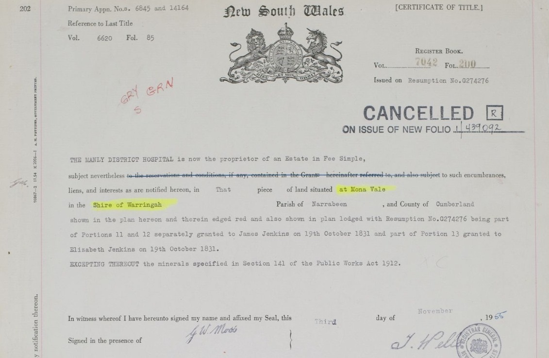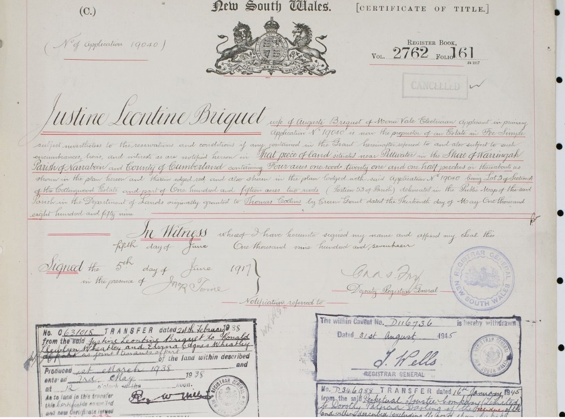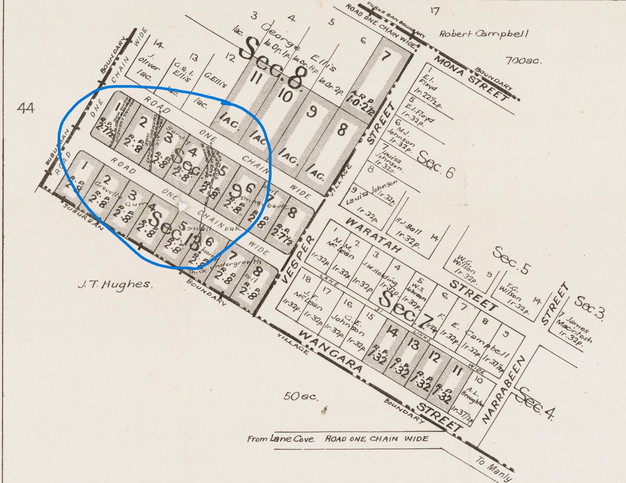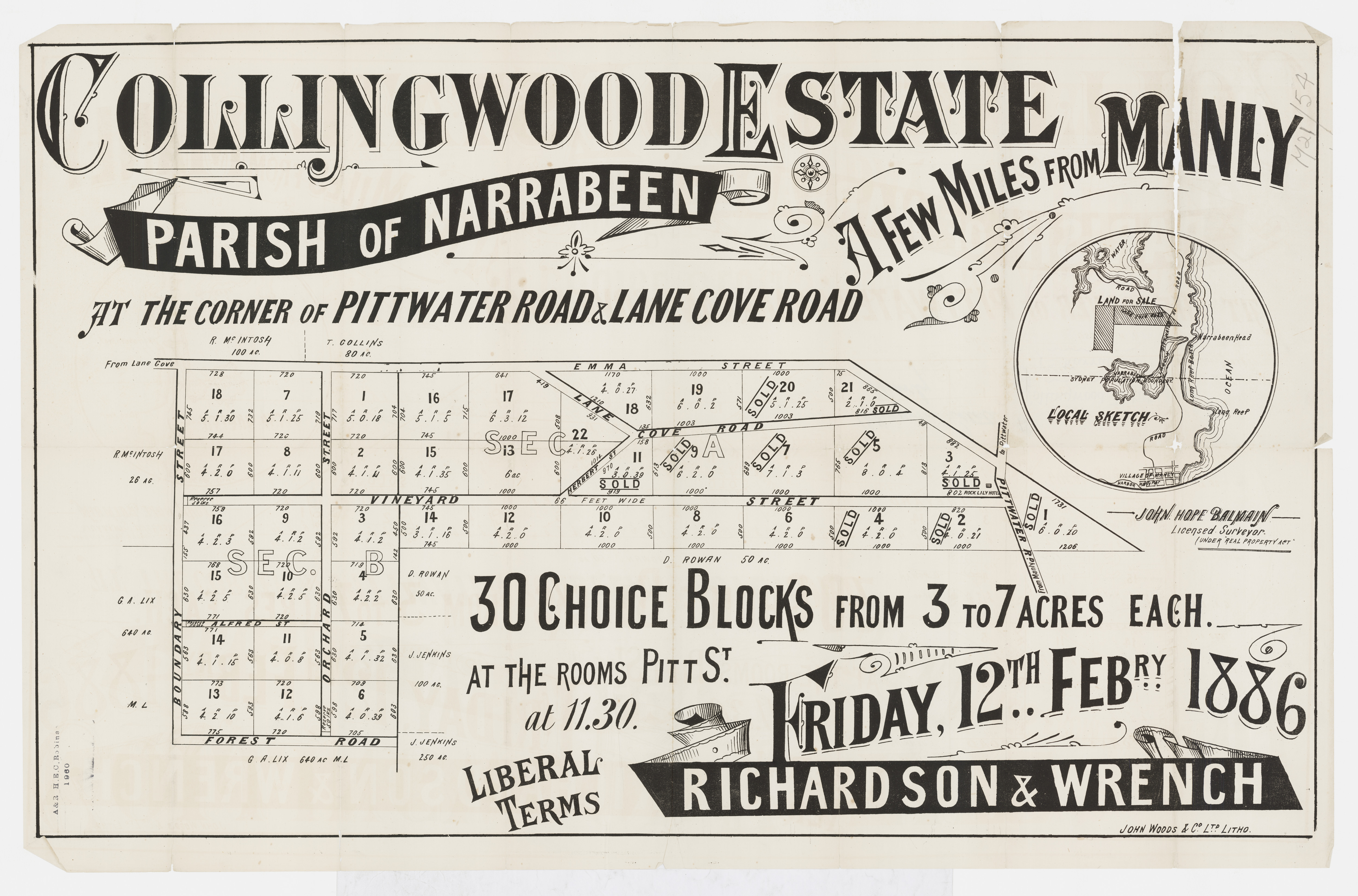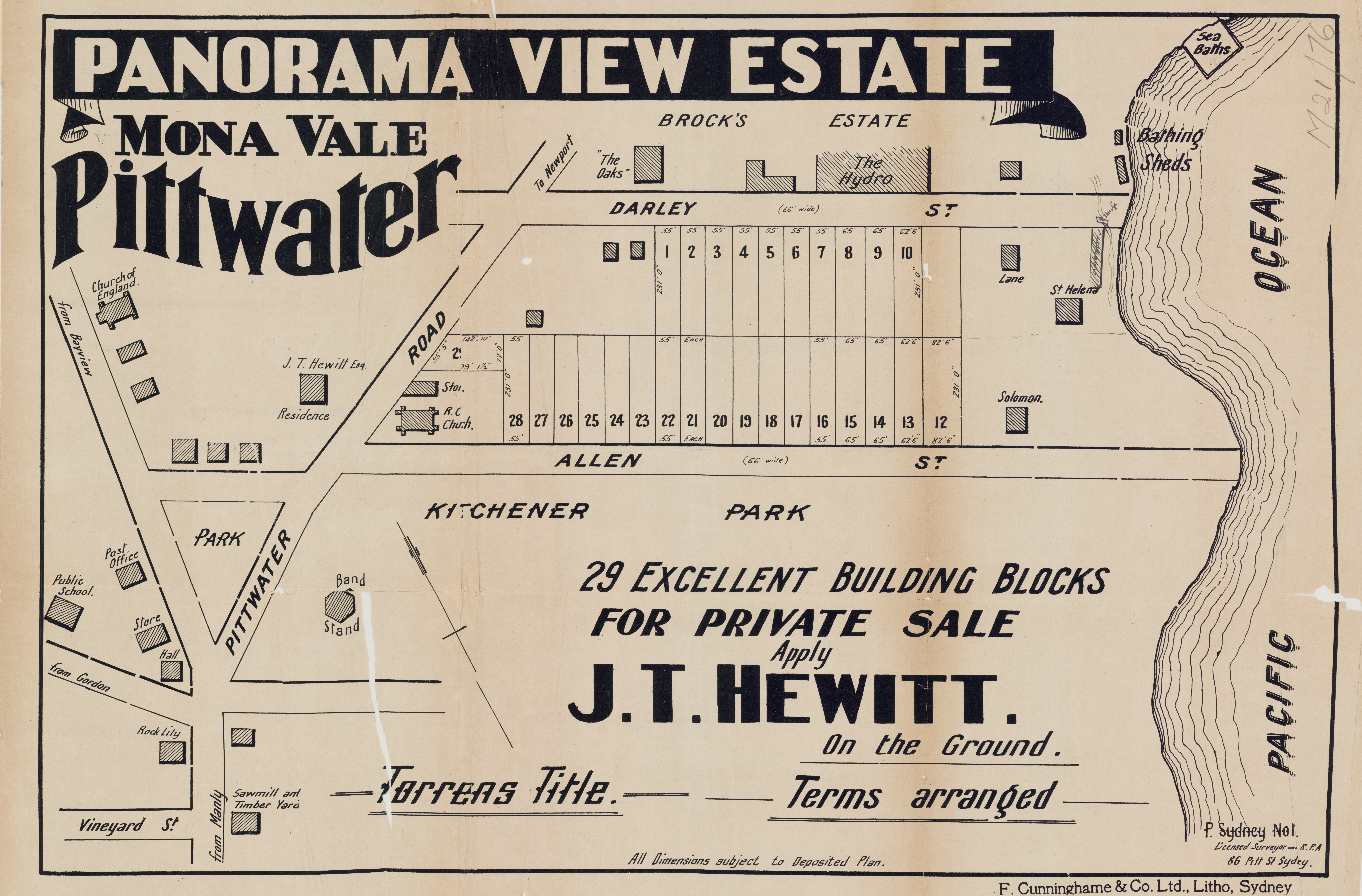 No. 19,041. APPLICANT:— Justine Leontine Briquet, Mona Vale. LAND: — County Cumberland, parish Narrabeen, shire Warringah, 6a. 27p. and 21 p., on Pittwater-road, — part lot 1, section A, Collingwood Estate, and part 115n. 2r, (portion 53, parish),granted to Thomas Collins; adjoining properties of Salvation Army, Cau and Schwartzcopf, and Crown Land. Advertising (1917, March 10). The Sun (Sydney, NSW : 1910 - 1954), p. 8. Retrieved from http://nla.gov.au/nla.news-article221960721