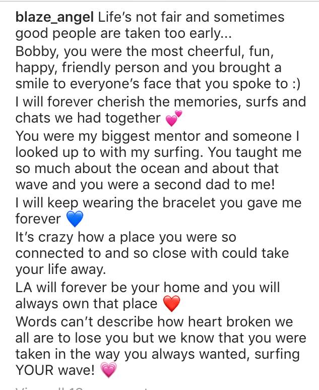 The loss of u has brought the surfers of LA closer then they’ve ever been and your loss encourages us to make sure we look after each other and don’t take the ocean for granted
