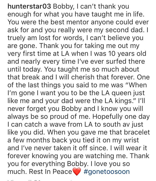 Having known Bob for all my life, it’s difficult to understand that someone so kind and loving could leave our Earth. It still feels surreal to me that Bob isn’t here anymore, however his presence in the water will never leave. Every time we paddle out to LA, we’ll still remember Bobby and his everlasting connection to the ocean.