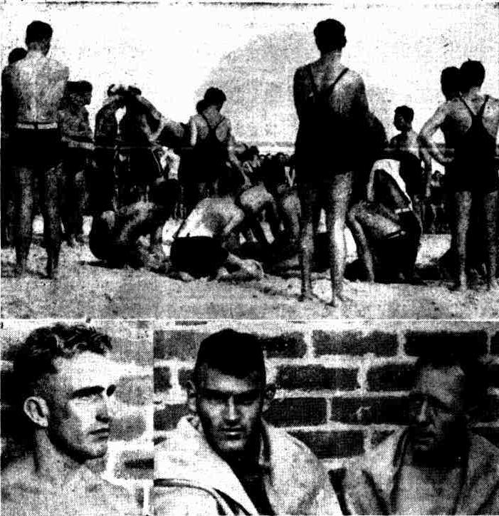 Scenes after the surfing tragedies at Bondi on Sunday. Top picture : Life-savers giving attention to bathers rescued from the surf. Lower pictures : Carl Jepperson (left) , the life-savers' captain, who made many rescues. Harry Freer and Harry Hoare, two of the surfers rescued, are shown in the picture at the right.