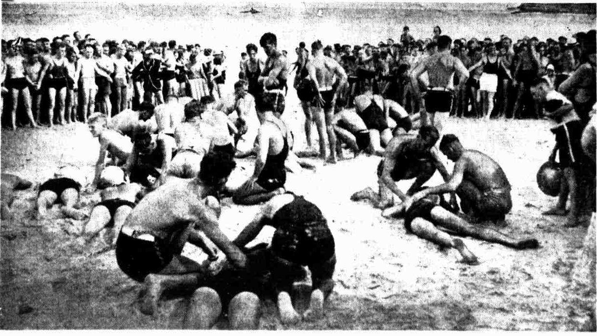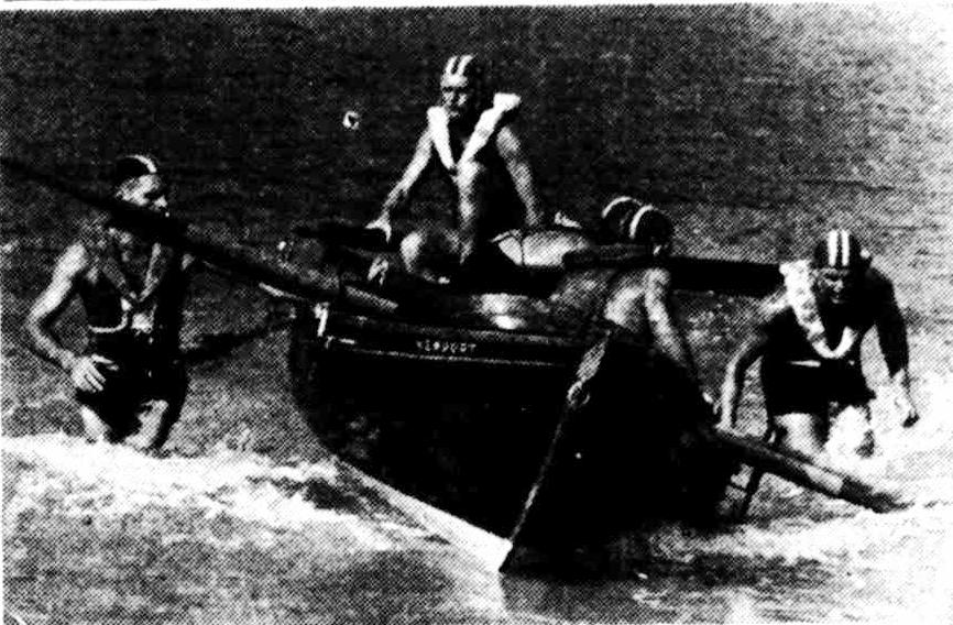 Lifesavers have received little or no support from the public in the past 30 years. It has been left to these splendid men to give this wonderful public service at their own expense. Well, the public can show a little appreciation of these men's efforts by attending the carnivals at Bondi to-day and Manly next Saturday In their thousands, and thus give a fillip to the funds of the association. To-day, the public will see representatives from New Zealand and every State of the Commonwealth in action. And these men have come here at their own expense. They are not allowed 5/ a day or more, as are our "amateur" tennis players, footballers, rowers, cricketers, etc and they pay their own fares, too.