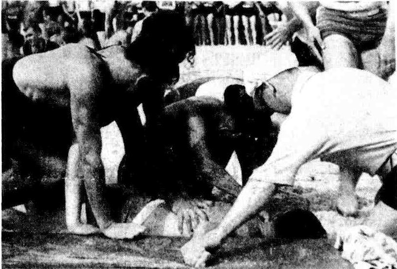 Resuscitation work being carried out by lifesavers and helpers on some of the men brought ashore yesterday in one of the most spectacular rescues in Australian surfing history.