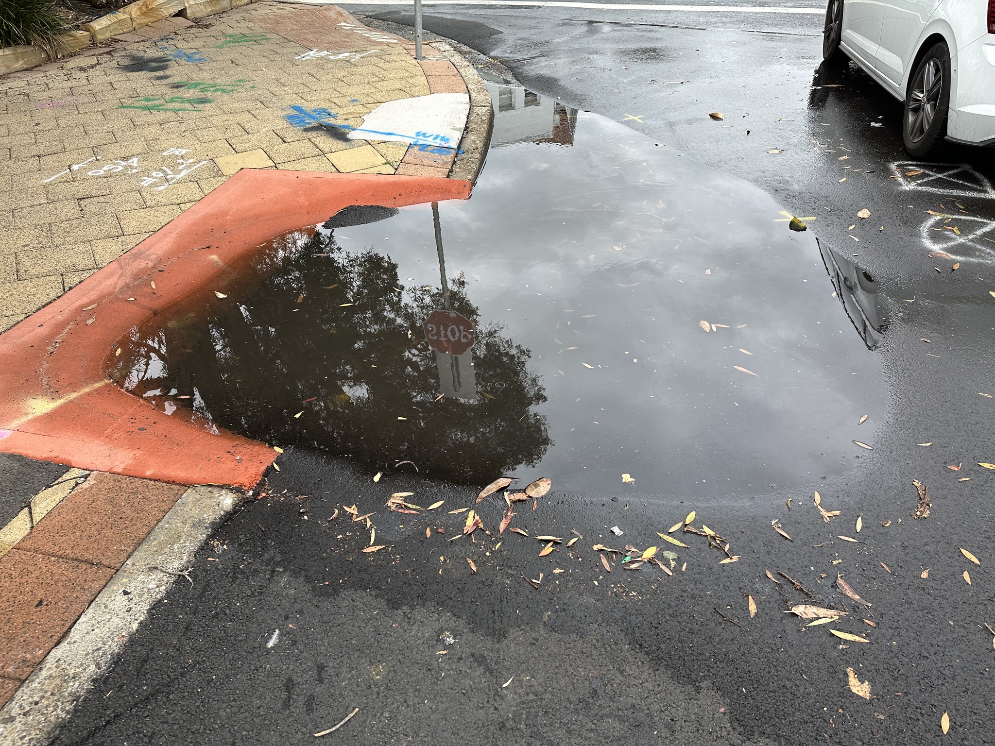 New laying of bitumen on Old Barrenjoey Road has resulted in flooding of the roadway and inundation of a pedestrian ramp over the past weekend and today.