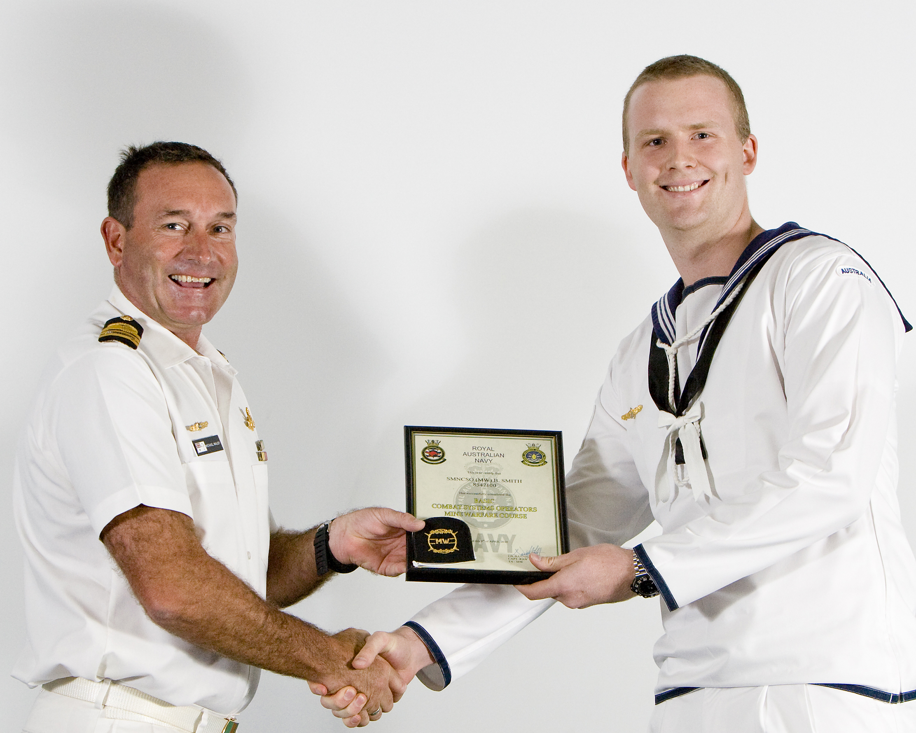 Commander Michael Maley, RAN, presents Seaman Combat Systems Operator (Mine Warfare) Blair Smith with his graduation certificate and rate badges. The Basic Combat Systems Operator Mine Warfare training commenced at HMAS Watson, with 8 weeks of core CSO and GCCS training. The course then moved to HMAS Waterhen where the students undertook 12 weeks of Mine Warfare training, including a 2 week period in the CSO Trainer as part of their final assessment. September 2010. Image courtesy Royal Australian Navy.