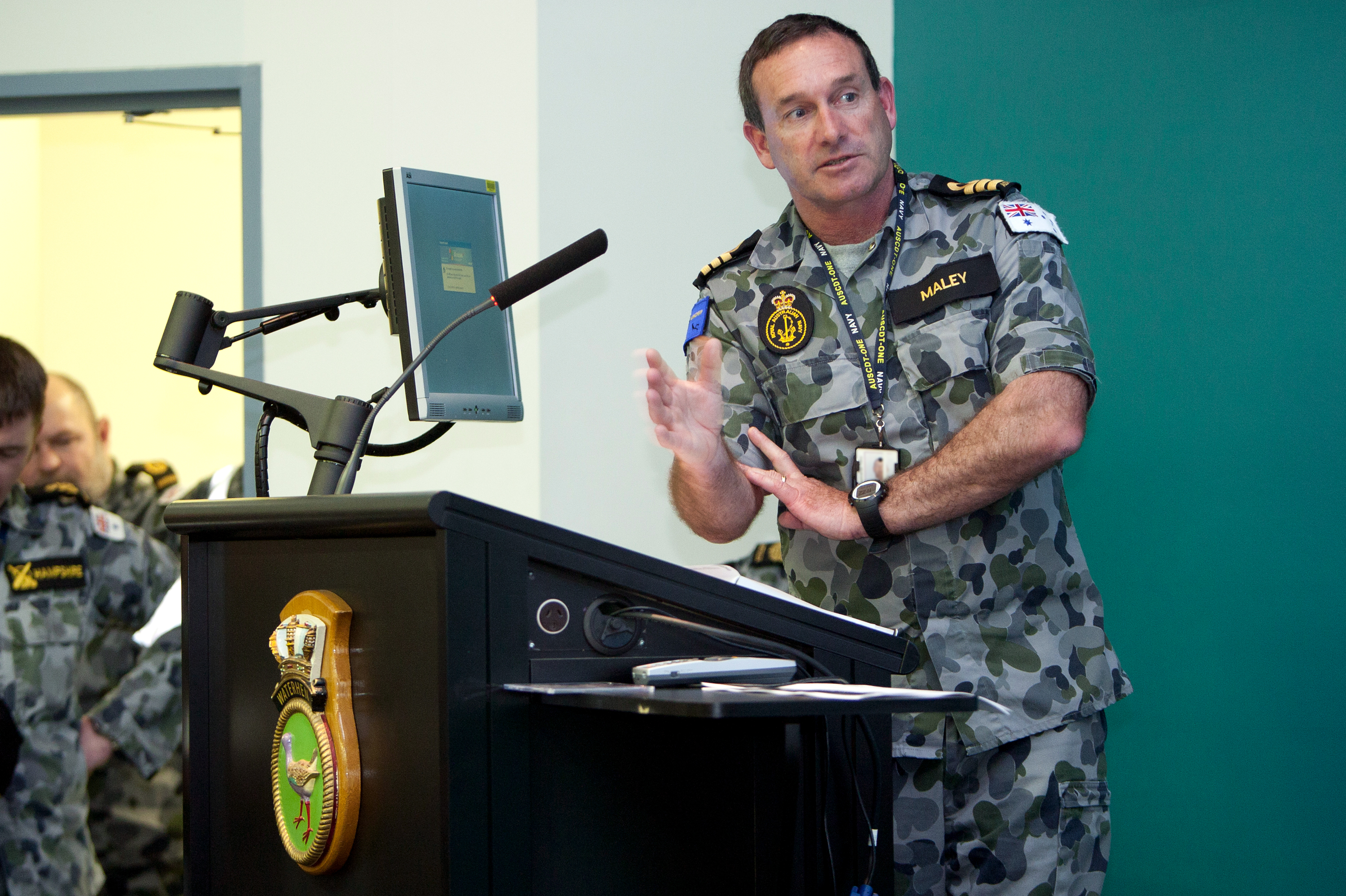 Commander Michael Maley, from the Mine Warfare and Clearance Diving Group makes a presentations as part of the Mine Clearance Diving Continuous Improvement Program at a clear lower deck for all HMAS WATERHEN personnel. October 2010. Image courtesy Royal Australian Navy.