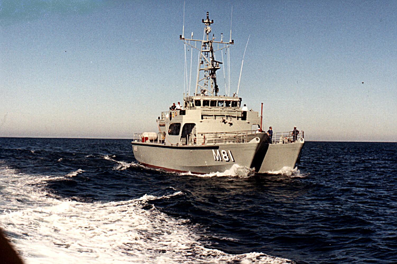 She was built by Carrington Slipways at its Ramsay Fibreglass facility in Tomago, New South Wales, launched on 20 June 1987 and commissioned on 10 October 1987. During her sea trials, Shoalwater travelled to Townsville where a number of charges were detonated around the vessel to test her tolerance to underwater explosions. Shoalwater performed above expectations during these tests. For the duration of her service with the RAN, Shoalwater was assigned to HMAS Waterhen in Sydney, where the Navy established a Mine Warfare Systems Centre ahead of the Bay class ships entering service.