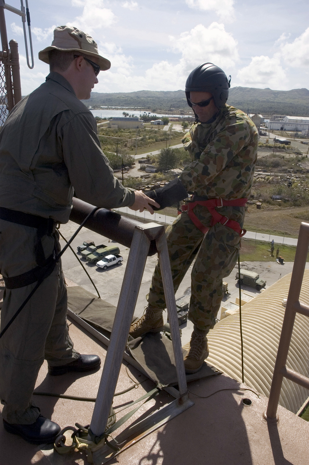 US Navy (USN) CHIEF PETTY Officer (CPO) Jeremy Logan (left), assigned to Explosive Ordnance Disposal Mobile Unit 5 (EODMU-5) gives last-minute advice to Royal Australian Navy (RAN) Lieutenant Commander (LCDR) Michael Maley, before he goes over the side of a wall during a fast rope exercise conducted at Santa Rita Naval Base, Guam (GU), during the Annual Multi-national Explosive Ordnance Disposal (EOD) Exercise known as TRICARB 2006." The Exercise brings together EOD Units from the US, Australia and Singapore. Image courtesy USN.