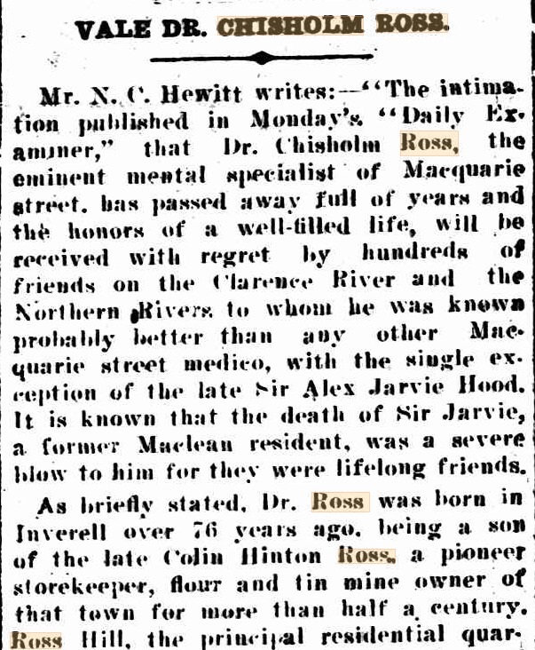 VALE DR. CHISHOLM ROSS. (1934, October 10). Daily Examiner (Grafton, NSW : 1915 - 1954), p. 6. Retrieved from http://nla.gov.au/nla.news-article193144284