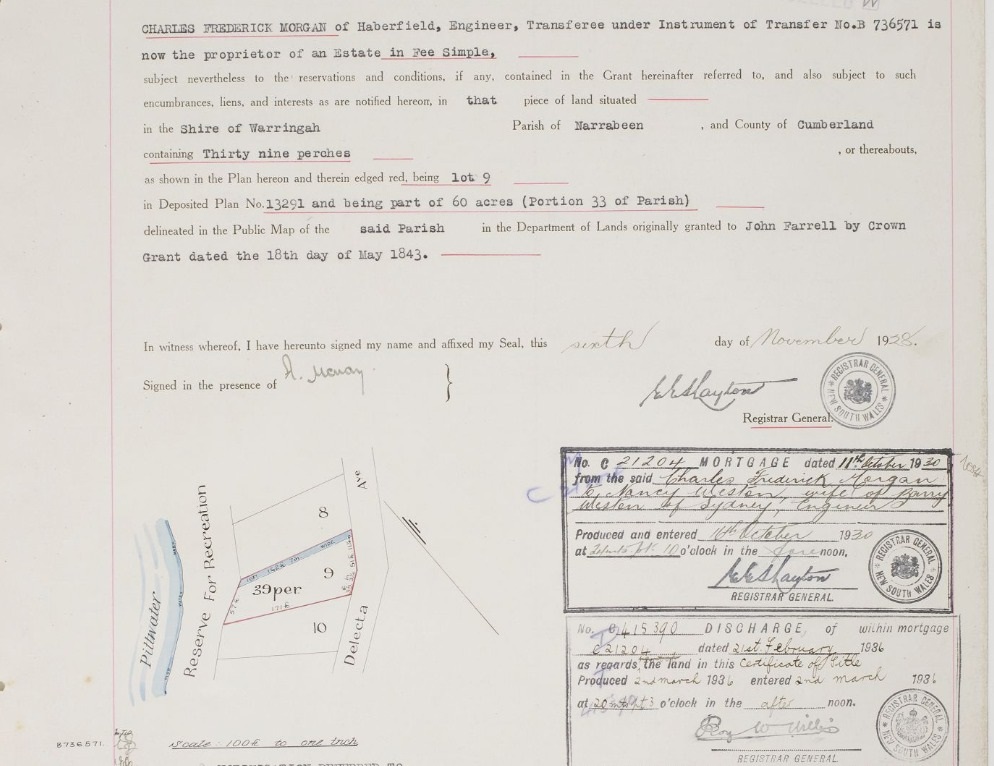 All that piece or parcel of land containing an area of about 39 perches* or thereabouts, being lot 9 in deposited plan No. 13,291, Delecta-avenue, Clareville, in the Shire of Warringah, parish of Narrabeen and county of Cumberland, and being the whole of the land comprised in Certificate of Title, volume 4,213, folio 104, and said to be in the possession of Esther Lea; also all that piece or parcel of land containing an area of about 1 rood 1 perch or thereabouts, being lot 8 in deposited plan No. 13291, Delecta-avenue, Clareville, in the Shire of Warringah, parish of Narrabeen and county of Cumberland, and being the whole of the land comprised in Certificate of Title, volume 4,530, folio 121, and said to be in the possession of Maurice Levy or Lea. 35—£4 5s. 6d. NOTICE OF RESUMPTION OF LAND BY WARRINGAH SHIRE COUNCIL.—Local Government Act, 1919.—Form 3 (1956, July 6). Government Gazette of the State of New South Wales (Sydney, NSW : 1901 - 2001), p. 1941. Retrieved from http://nla.gov.au/nla.news-article220388245