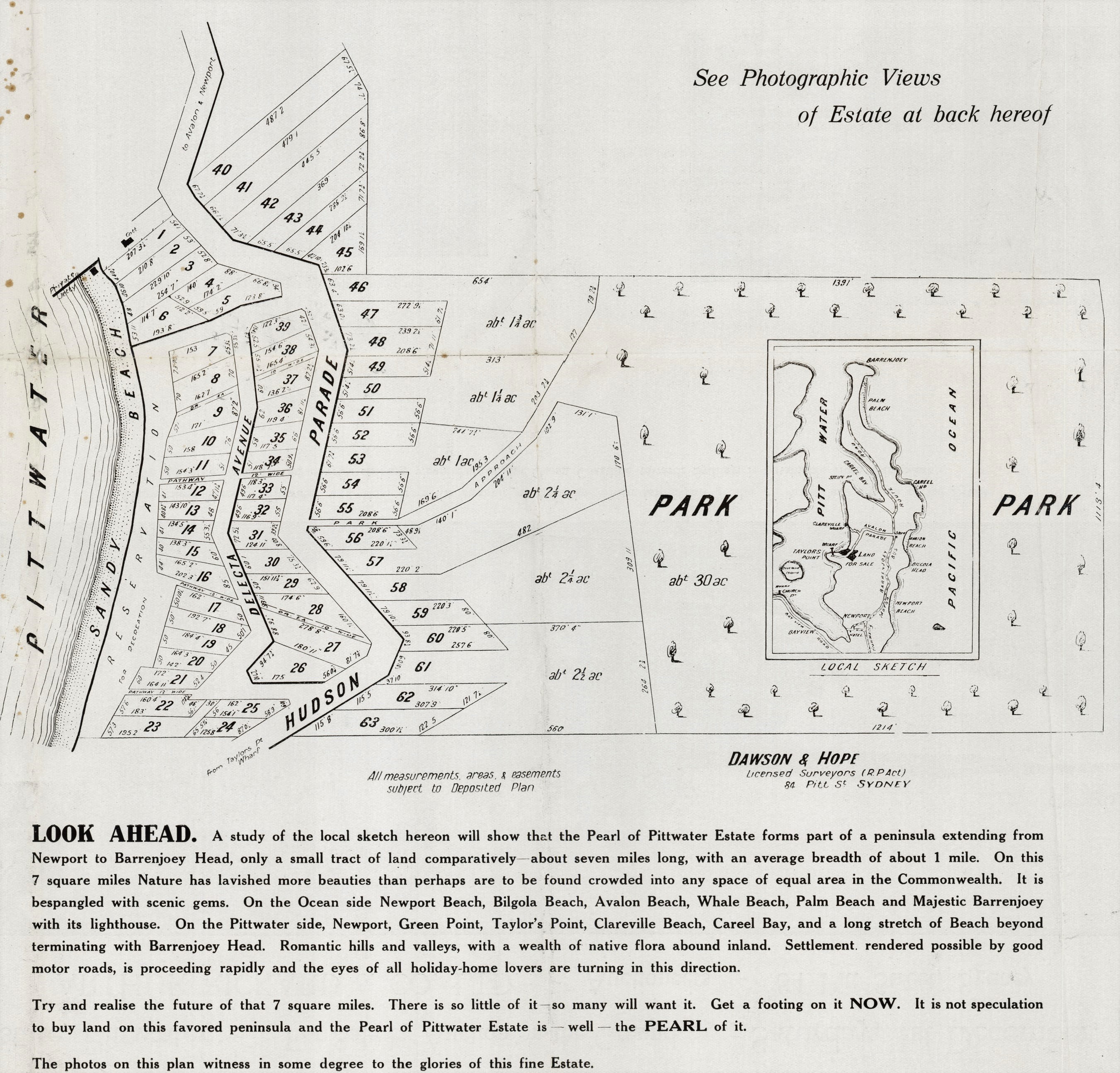 Pittwater Clareville Ocean Beach Estate - Central Rd, Barrenjoey roads - A J Small. Item No.: c027560009 [Avalon subdivision plans] - courtesy State Library of New South Wales. And sections from to show residences and name for Avalon Beach.