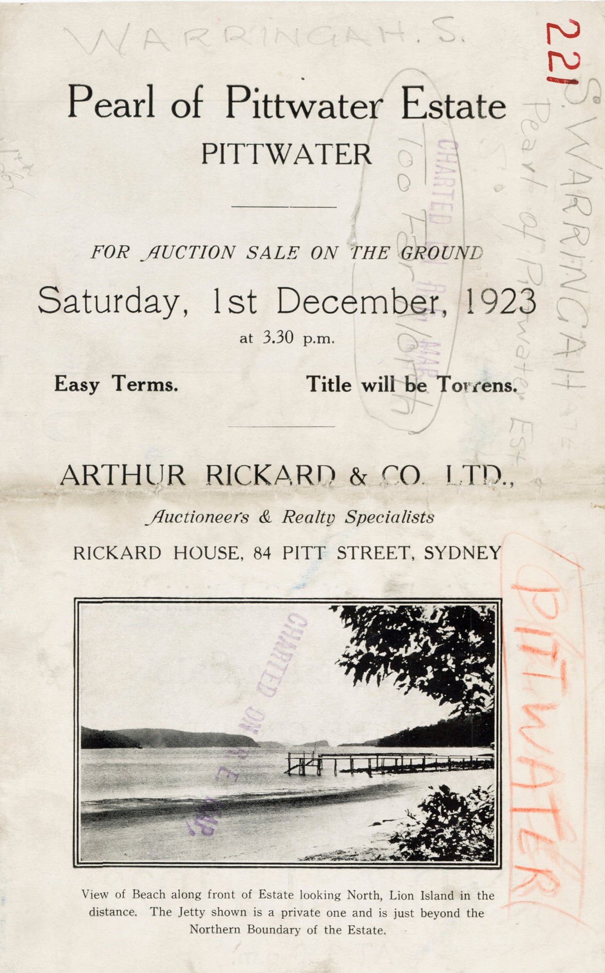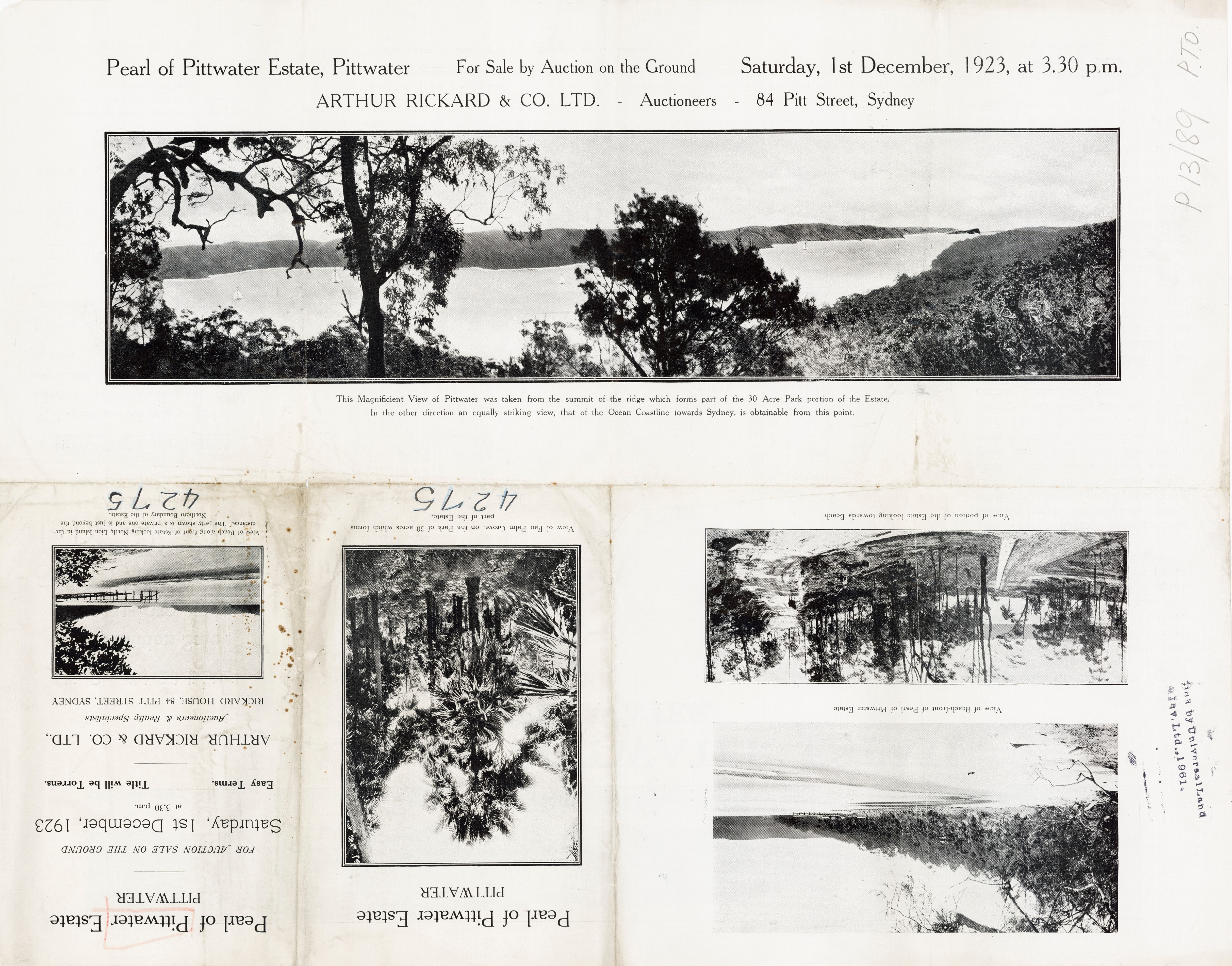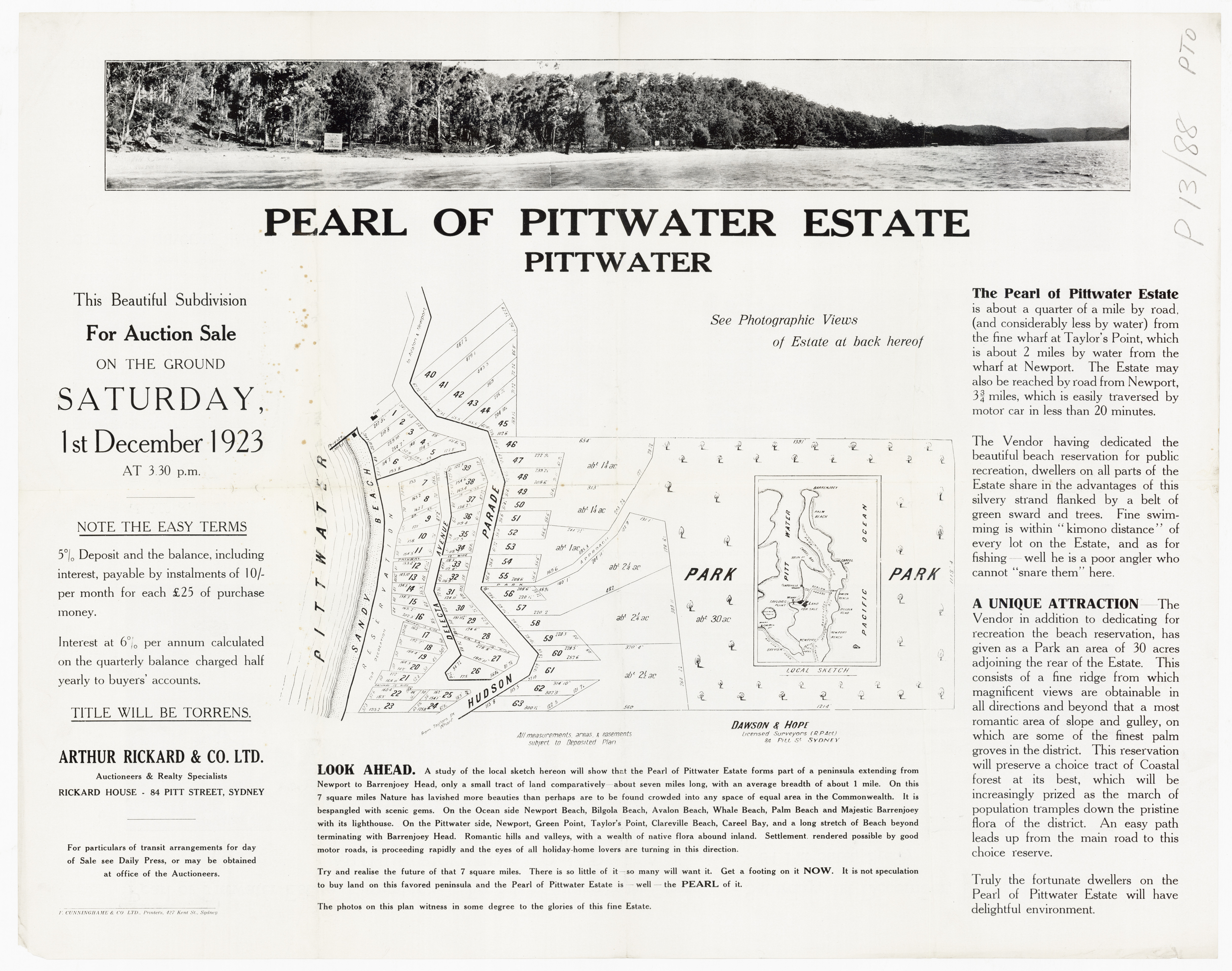 View of portion of the Pearl of Pittwater Estate, which is to be auctioned by Arthur Rickard and Co., Ltd., at Pittwater next Saturday. There is a fine selection of land to choose from, and the views from every block are delightful. THE PEARL OF PITTWATER. (1923, November 24). The Daily Telegraph (Sydney, NSW : 1883 - 1930), p. 10. Retrieved from http://nla.gov.au/nla.news-article245988634