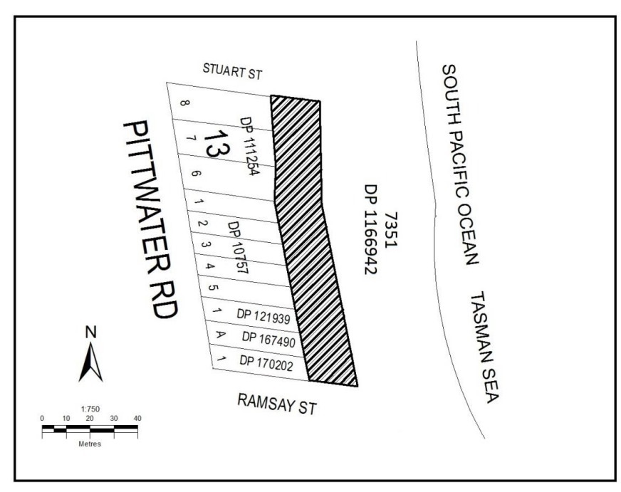 ‘The area of land 20m wide bound to the east by a line parallel to the eastern boundaries of Lots 6 to 8 Section 13 DP 111254, Lots 1 to 5 DP 10757, Lot 1 DP 121939, Lot A DP 167490 and Lot 1 DP 170202 and bound to the north by the prolongation of the northern boundary of Lot 8 Section 13 DP 111254 to the east and bound to the south by the prolongation of the southern boundary of Lot 1 DP 170202 to the east as indicated by hatching on the diagram below.’