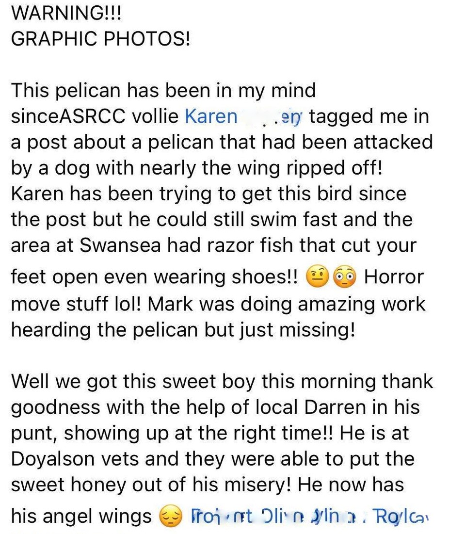 This poor pelican, a not endangered but still having a right to live peacefully species, underlines why the Central Coast council is addressing 21st century illegalities and challenges: