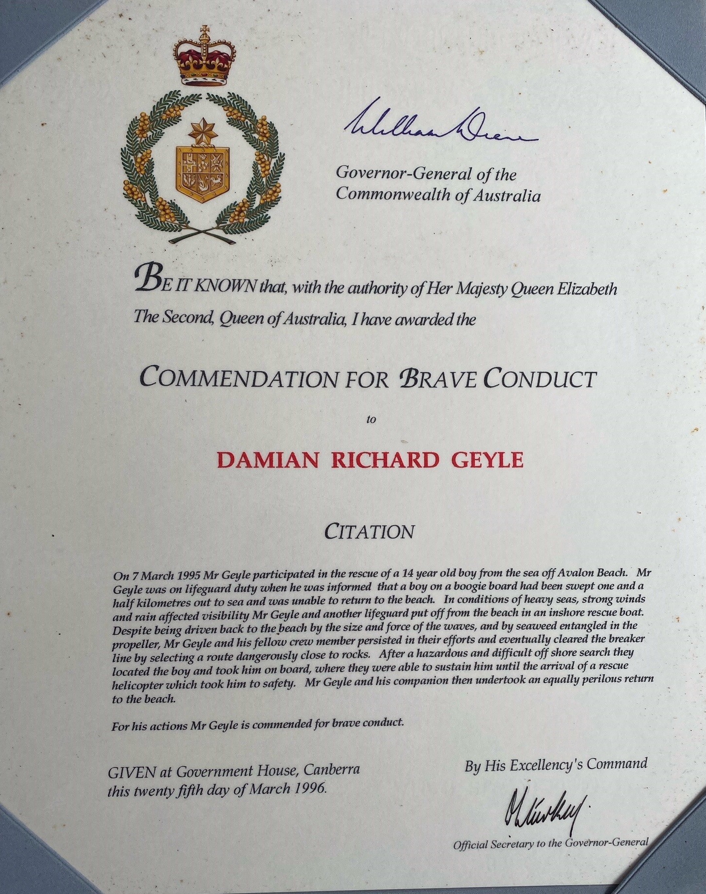 In 1994 he finished studies for a BHMS (Sports Management). In 1996 Damian received a Commendation for Brave Conduct 'for acts of bravery'. He has also received the Royal Humane Silver Medal, 1996, and the Surf Life Saving NSW Bronze Medal, 1996.