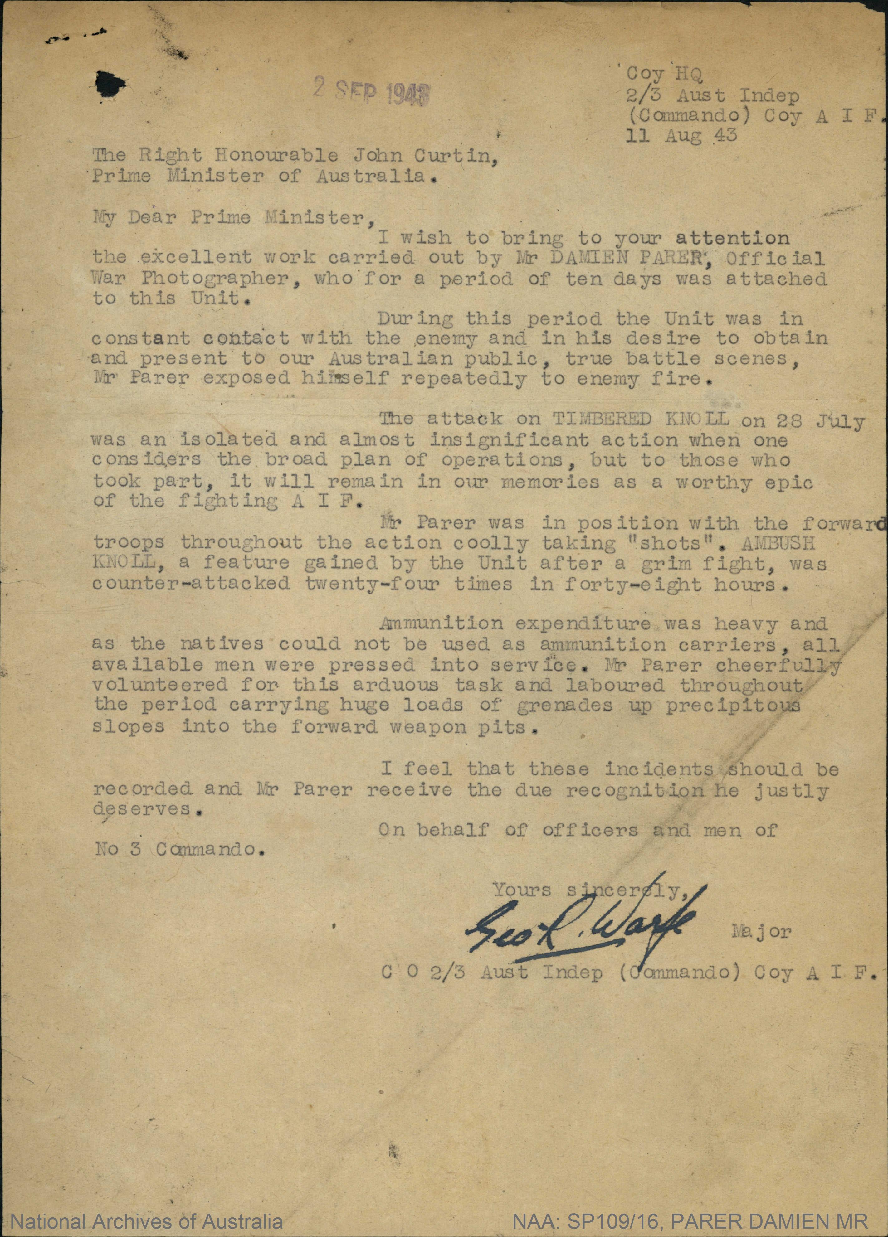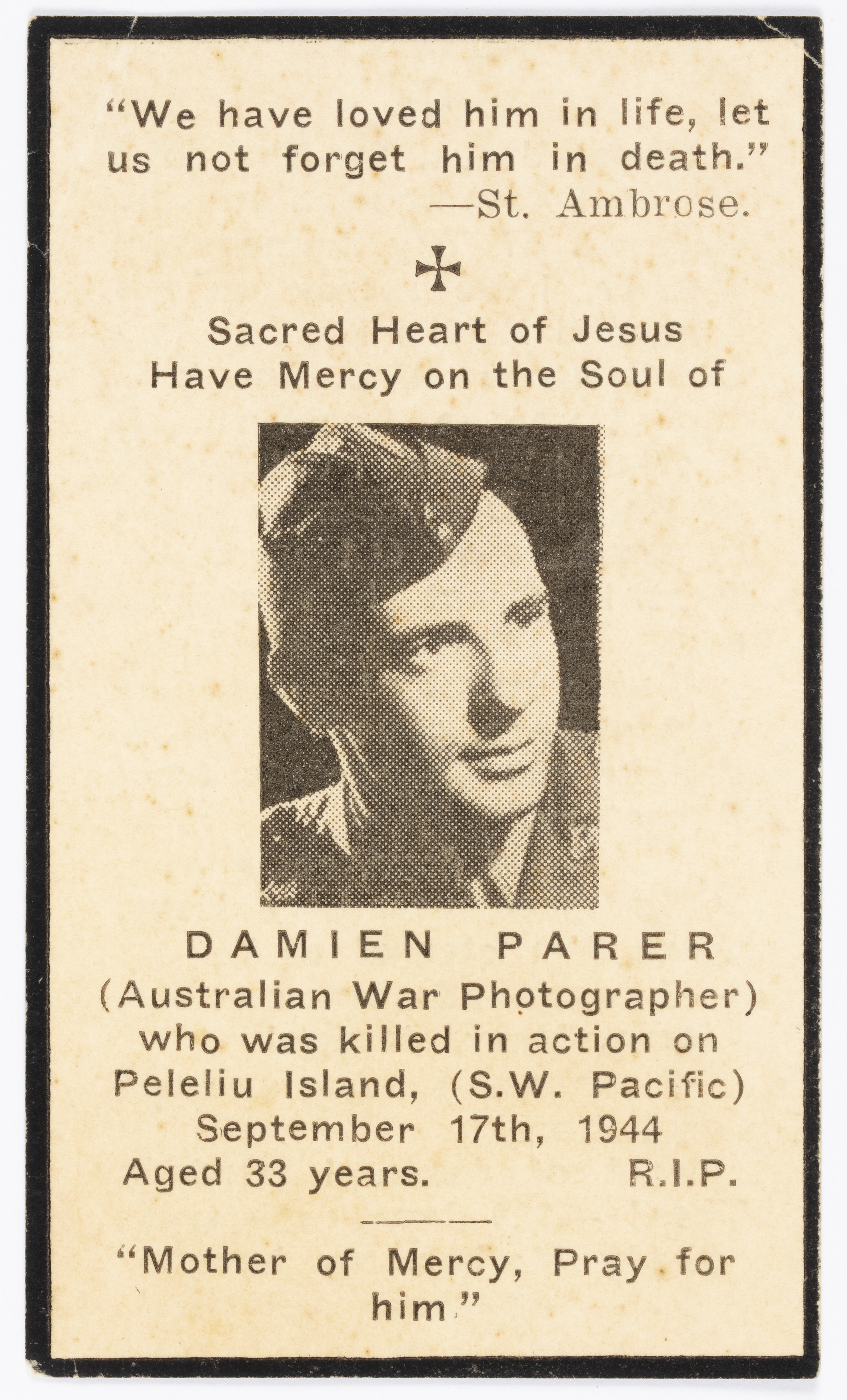 Damien Peter Parer (August 1st 1912 – September 17th 1944) was an Australian war photographer. He became famous for his war photography of the Second World War, and was killed by Japanese machine-gun fire at Peleliu, Palau. He was cinematographer for Australia's first Oscar-winning film, Kokoda Front Line!, an edition of the weekly newsreel, Cinesound Review, which was produced by Ken G. Hall.