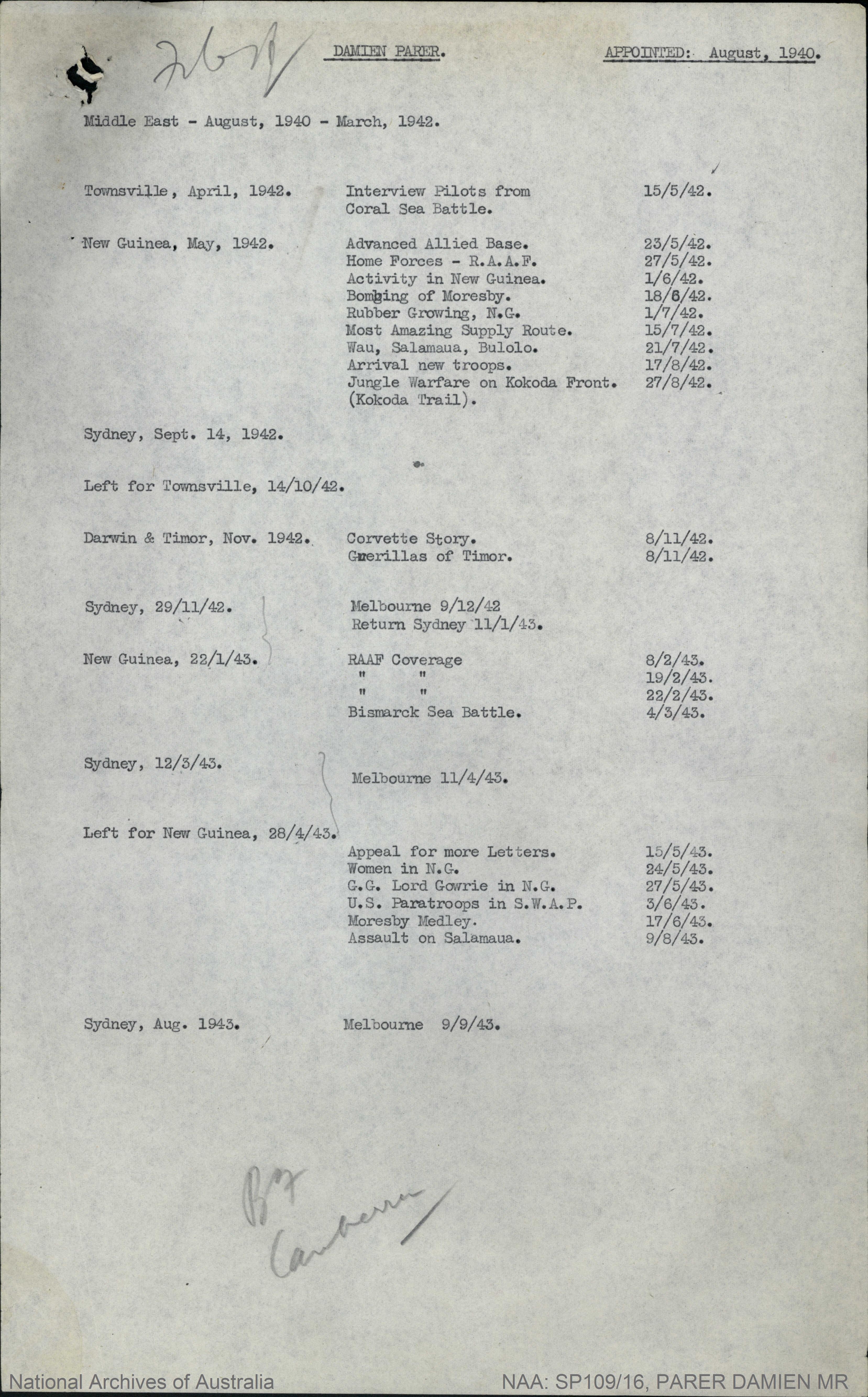 In 1939 Damien was appointed to the staff of the cinema and photographic branch of the Commerce Department of the Commonwealth Government. And then another telegram changed the direction of his life. He received it on 30 August 1939 at the “Oriana Hotel”, McLeay Street, Potts Point, Sydney: