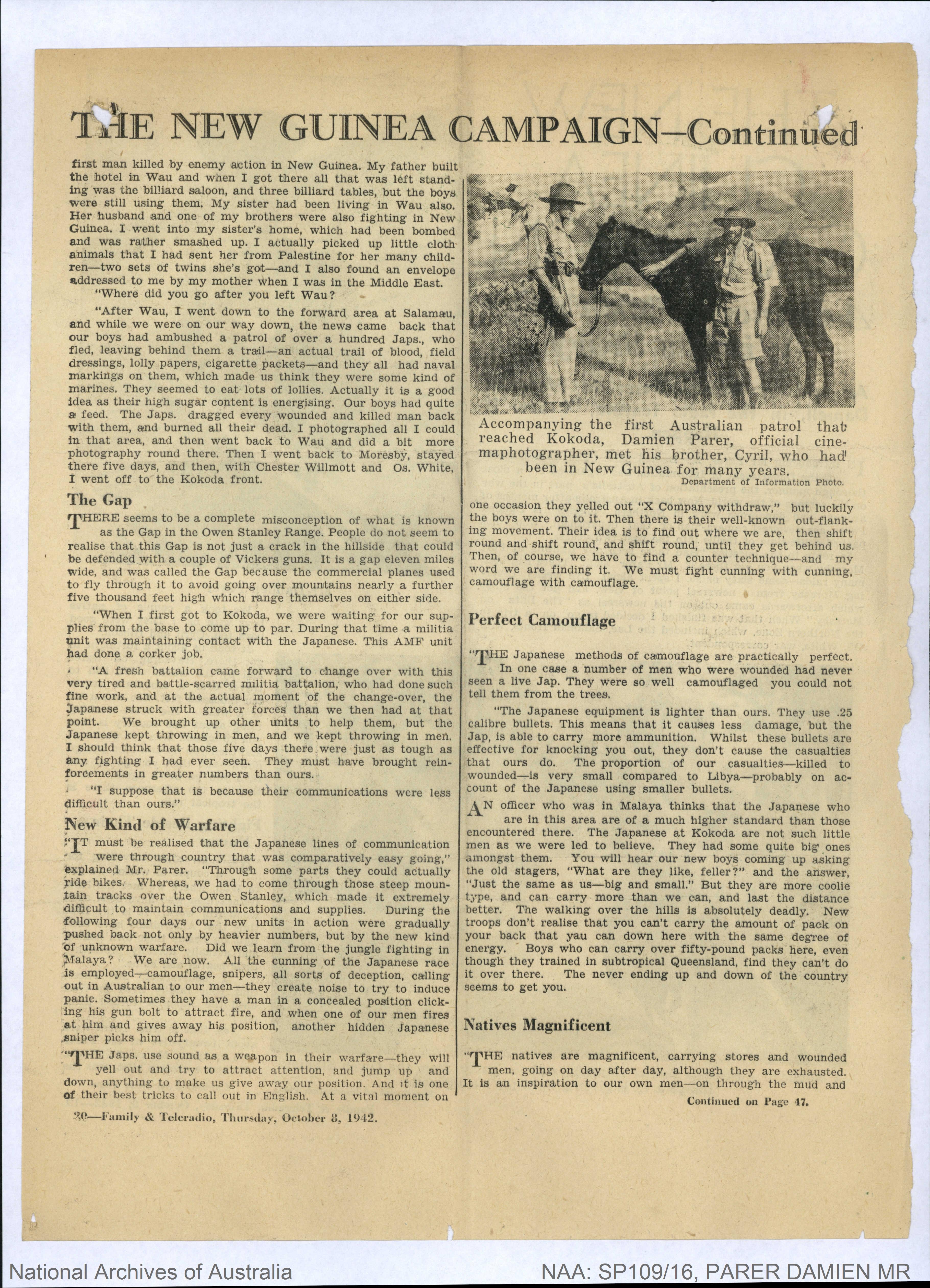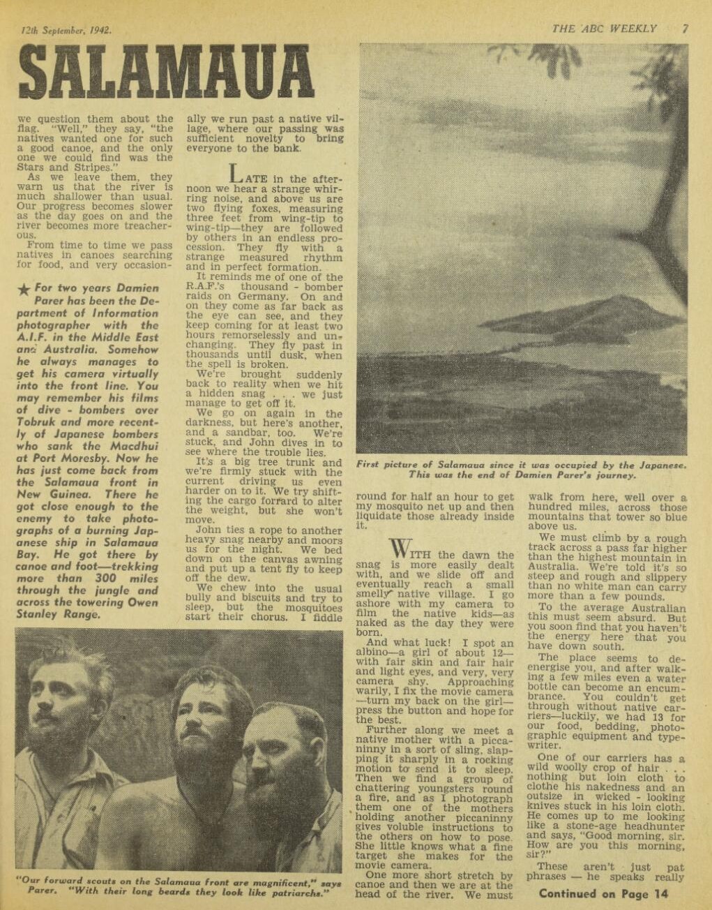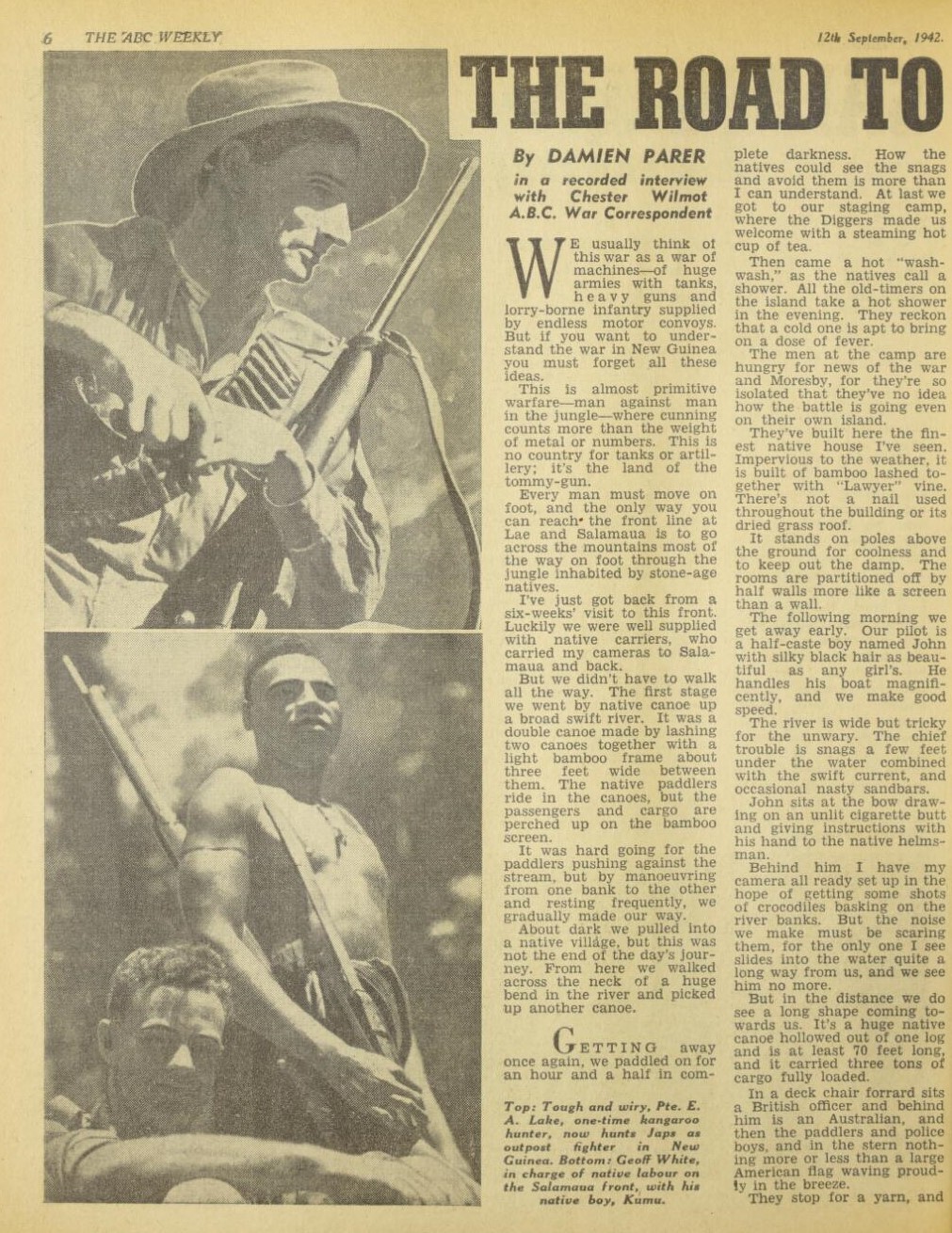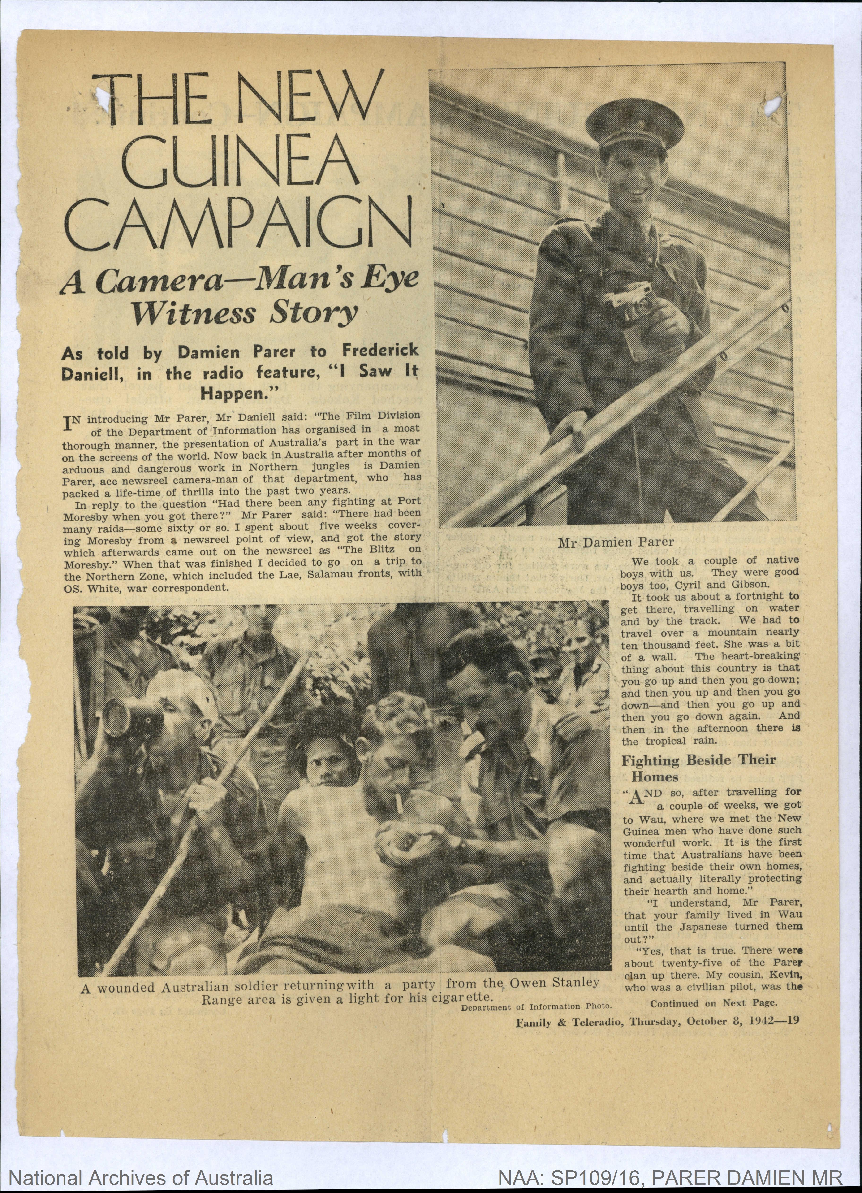 By mid-1942 Parer was in New Guinea ready to cover the fighting against the Japanese. Together with war correspondent Osmar White, he undertook an arduous journey by schooner, launch and on foot from Port Moresby to Wau via Yule Island, Terapo and Kudjiru, in order to document the efforts of the meagre forces then fighting on the northern coast of Papua New Guinea.