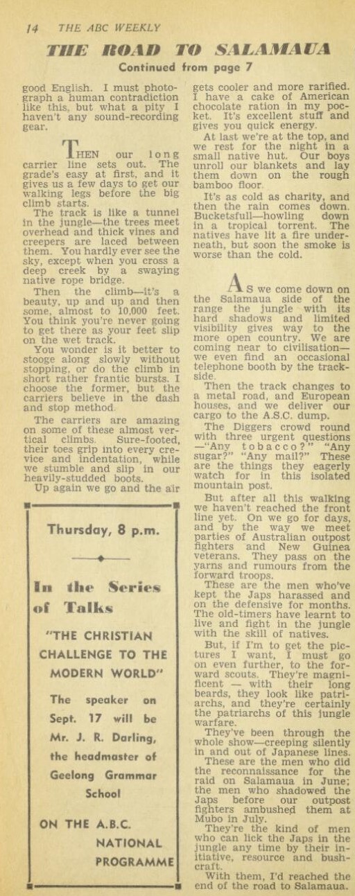 Australian Broadcasting Commission. (Vol. 4 No. 37 (12 September 1942) ). THE ROAD TO SALAMAUA, ABC weekly Retrieved from http://nla.gov.au/nla.obj-1329221802