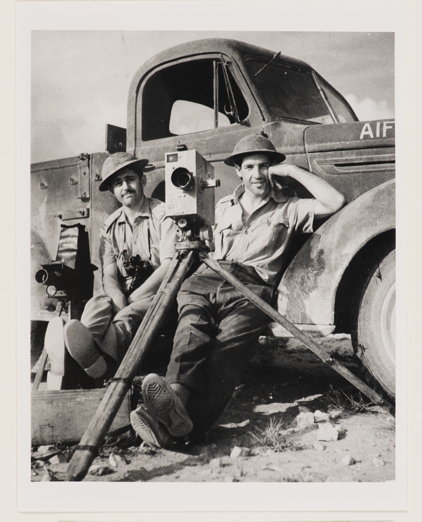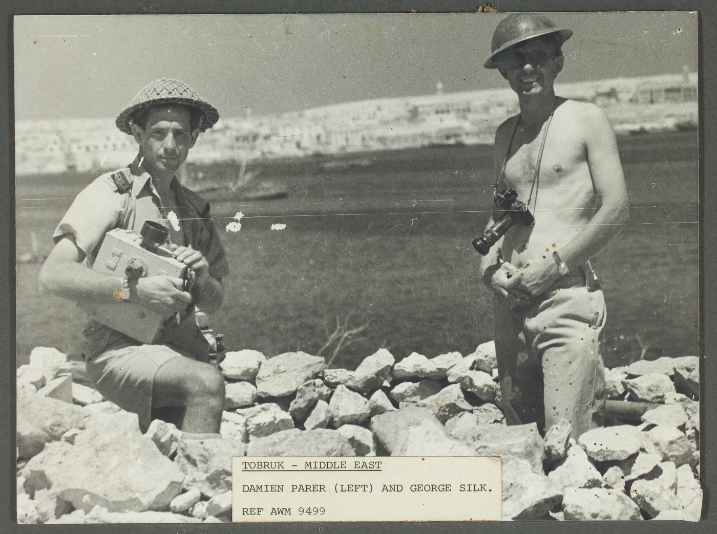 Damien Parer and George Silk [with cameras], Tobruk [August 1941. Dated and captioned in AWM Collection Database: ID No: 009499. 1941-08. TOBRUK. DAMIEN PARER AND A.G. SILK IN "HIDE OUT" ON EDGE OF TOBRUK HARBOUR WAITING FOR AIR RAID. (NEGATIVE BY G. SILK).] Item: a9575023h, courtesy Mitchell Library, State Library of New South Wales