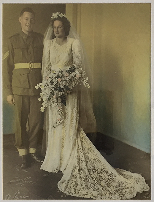 “I met my husband during the last year of the war. We were engaged after six weeks and we got married before the end of the war. The wedding dress I wore had been worn three times before and I was told to pass it on after my wedding. My family pooled their coupons for a going away outfit.”