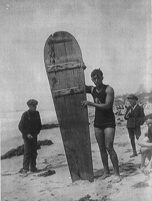 That is what it is (writes Jack London, in the "Pall Mall Magazine"), a royal sport for the natural kinds of earth. The grass grows right down to the water at Waikiki beach, and, within fifty feet of the everlasting sea. The trees also grow down to the salty edge of things, and one sits in their shade and looks seaward at a majestic, surf thundering in on the beach to one's very feet. Half a mile out, where is the reef, the whiteheaded combers thrust suddenly skyward out of the placid turquoise-blue, and come rolling in to shore. And suddenly, out there where a big smoker lifts skyward, rising like a sea-god from out of the welter of spume and churning white, on the giddy, toppling, overhanging and downfalling. precarious crest appears the dark head of a man. Swiftly he rises through the rushing white. His black shoulders, his chest, his loins, his limbs—all is abruptly projected on one's vision. Where but the moment before was only the ocean's wide desolation and Invincible roar is now a man, erect, full statured, not struggling frantically in that wild movement, not buried and crushed, and buffeted by those mighty monsters, but standing above them all, calm and superb, poised on the giddy summit, his feet buried in the churning foam, the salt smoke rising to his knees, and all the rest of him.-in the free air and flashing sunlight, and he is flying through the air, flying forward, flying fast as the surge on which he stands. In truth, from out of the sea he tyas leaped upon the back of the sea, and he is riding the sea that roars and Mellows and cannot shake him from its back. And straight on towards shore he flies on his winged heels, and the white crest of the breaker. There is a wild burst of foam, a long, tumultuous, rushing sound, as the breaker falls futile and spent on the beach before you and there, at your feet, steps calmly ashore, a Kanaka, burnt black by the tropic sun. Several minute's ago he was a speck, a quarter of a mile away. He has "bitted the bull-mouthed breaker," and ridden it in, and the pride in the feat, shows in the carriage of his magnificent body as he glances for a moment carelessly at you who sit in the shade of the shore. And that is how it came about that I tackled surf-riding. And now that I have tackled it, more than ever do I hold it to be a royal sport. I deserted the cool shade, put on a swimming-suit, and got hold of a surfboard, it was too small a board. But I didn't know, and nobody told me. I joined some little Kanaka boys in shallow water, where the breakers were well spent and small—a regular kindergarten school. I watched the little Kanaka boys. When a likely looking breaker came along, they flopped upon their stomachs on their boards, kicked like mad with their feet, and rode the breaker in to the beach. I tried to emulate them. I watched them, tried to do everything that they did, and failed utterly. The breaker swept past, and I was not on it. I tried again and again. I kicked twice as madly as they did, and failed. Half a dozen would be around. We would all leap on our boards in front of a good breaker. Away our feet would churn like the stern-wheels of river steamboats, and away the little rascals would scoot while I remained in disgrace behind. I tried for a solid hour, and not one wave could I persuade to boost me shoreward.