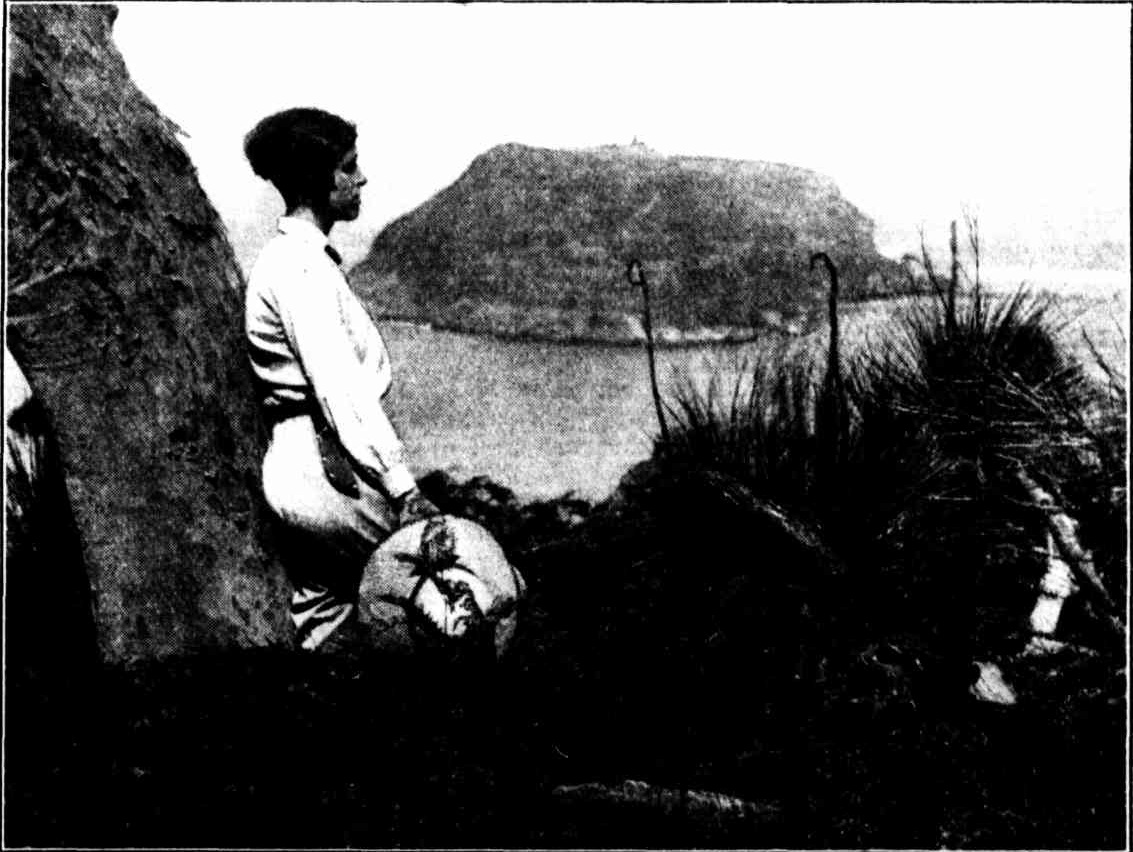 Once a dauntless company of adventurers (three in number) set off on the Newport 'bus, with an enormous picnic basket, and made their way through the callistemon scrub, that seemed all afire with blossom, towards the cliffs where hides the Hole in the Wall. There was some good scrambling before the basket was set safely on a ledge and the steep path to the cave was discovered and essayed. It is a most impressive cave, full of the footmarks of little wild creatures, and very dark and cavernous towards the rear, where a fall of rock has blocked what, was, I believe, at one time a landward exit. Anyway, it was a good cave for adventures, and could quite suitably, have been used to hide a chest of pirate treasure. (Anyone want to fit out an expedition to go there and make sure ?) It was pity Cinderella did not have her camera along that day: but she could hardly have taken a snap of herself dauntlessly climbing up to the cave mouth, and the comrades below were too steeply below to have done so, either.