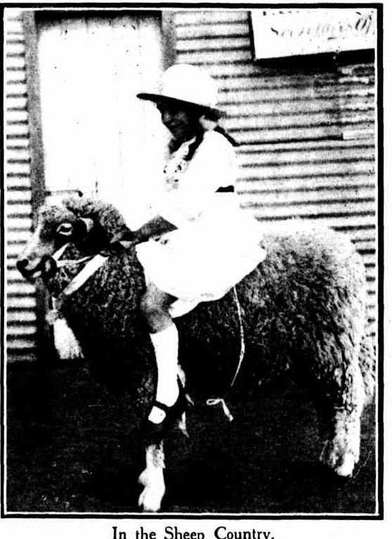 In the Sheep Country. This little girl, who lives in the Henty district, N.S.W., rode about the ground at the last Henty show on her pet lamb. She has two other lambs broken to saddle and harness.