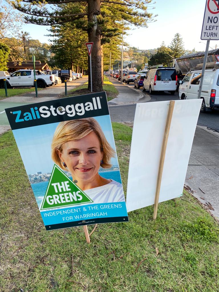 On Friday May 6th the Greens Northern Beaches posted this via their Twitter feed ''For reference, the corflute at the back is one of ours (Greens)'':