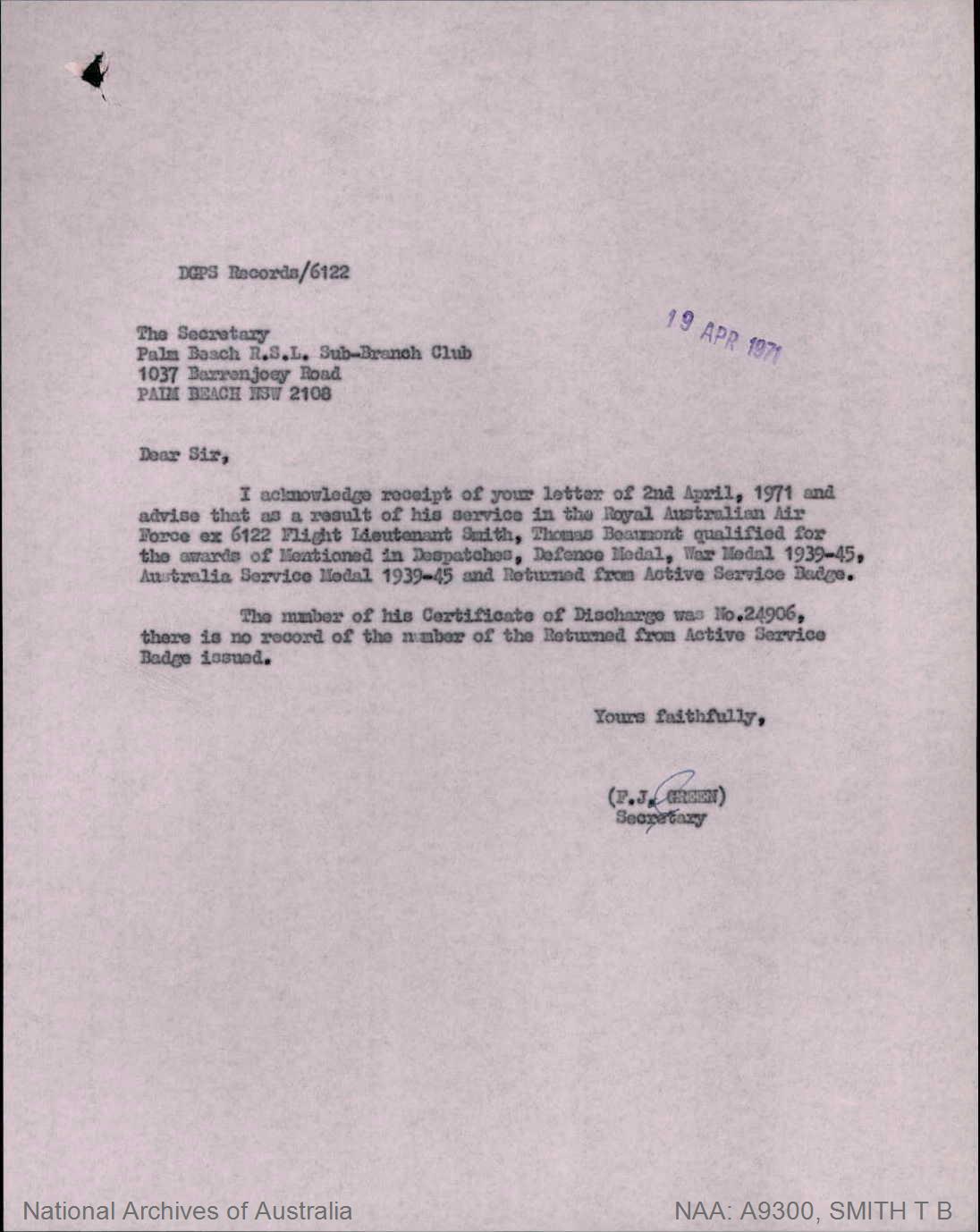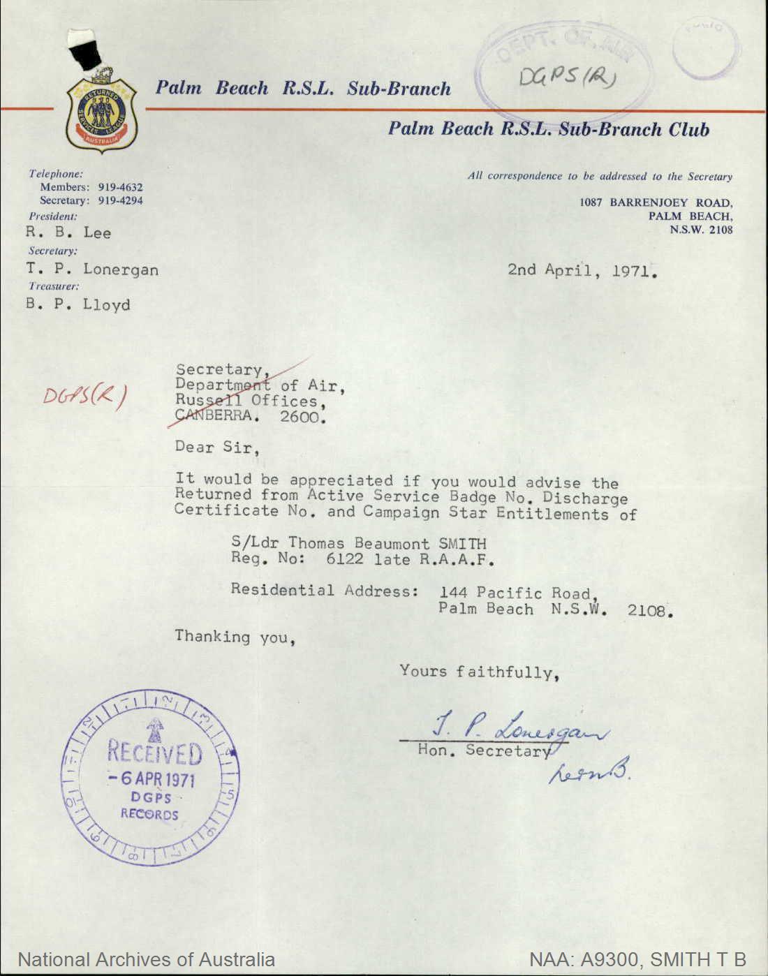 After his divorce, and the selling of the business, he lived at 144 Pacific Road, Palm Beach. This was then a small timber and stone cottage up behind the Palm Beach fish and chips shop, built in the 1930’s. The home was sold after his death, and was held by the same family until they sold in 2014. Thomas Beaumont Smith became a Veteran Member of Palm Beach RSL: