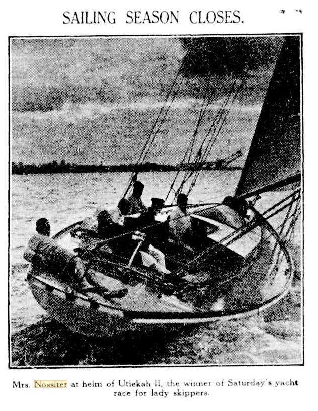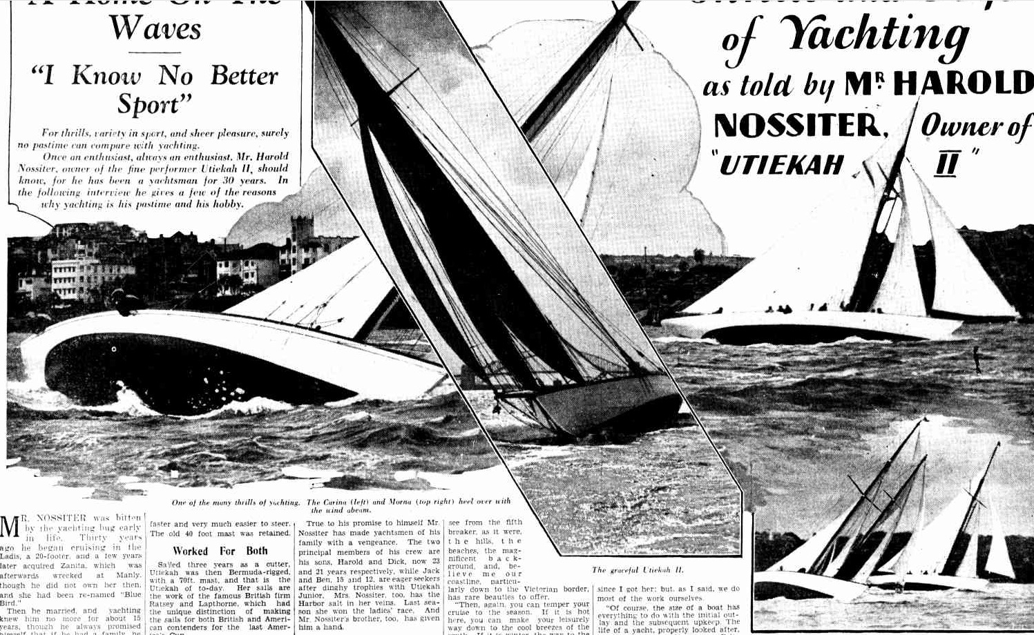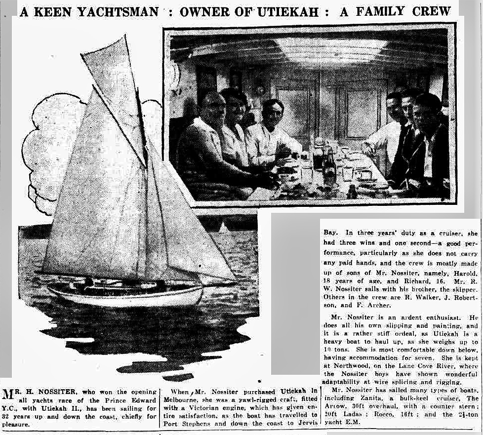 There is great joy, consistent with respectability and modesty, in the home circle of Mr. H. Nossiter, at Northwood, on the Lane Cove River. It all arose over the possession of a cup of ancient origin. When Mr. Nossiter and his four mariner sons are not at home at Northwood they are at home in yachts on the Harbour. Last Saturday, Mr. Nossiter, senior, sailed his Utiekah II, a winning race for the possession of the F. J. Jackson Cup. That a cup should have survived for 58 years the rust and moths that corrupt, and the thieves that break through and steal, is wonderful, but apparently it has, and the veteran yachtsman has possession of it. Always a sea lover, Mr. Nossiter has no time for anything else but the proper conduct of an Important department at Dalgety's and yachting. He probably could have been an International League Rugby player or a rider of buckjumpers in a rodeo show, but he started sailing in his Infancy, and has remained a sailor ever since. In his younger days he owned the 20-footer Ladas, the Viking, the Arrow, and the Zenita in turn. Now he has two Utiekahs, one the yacht which he sails with his two older sons, and the other a dinghy sailed by the younger boys. When the racing season is over he and the boys go cruising up; and down the coast, and they spend every week-end on the yacht in one of the bays of the Harbor. Mariners All (1932, November 23). Referee (Sydney, NSW : 1886 - 1939), p. 12. Retrieved from http://nla.gov.au/nla.news-article135334787