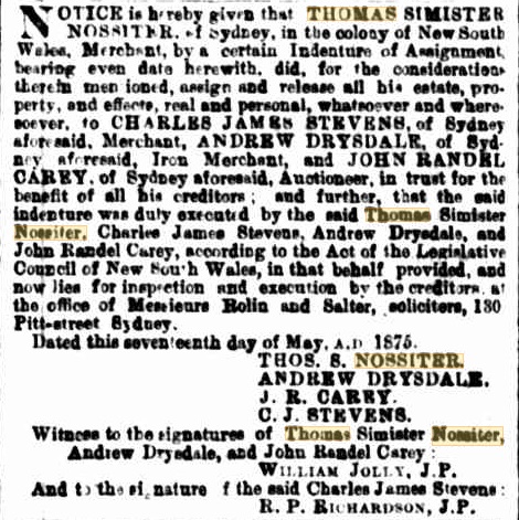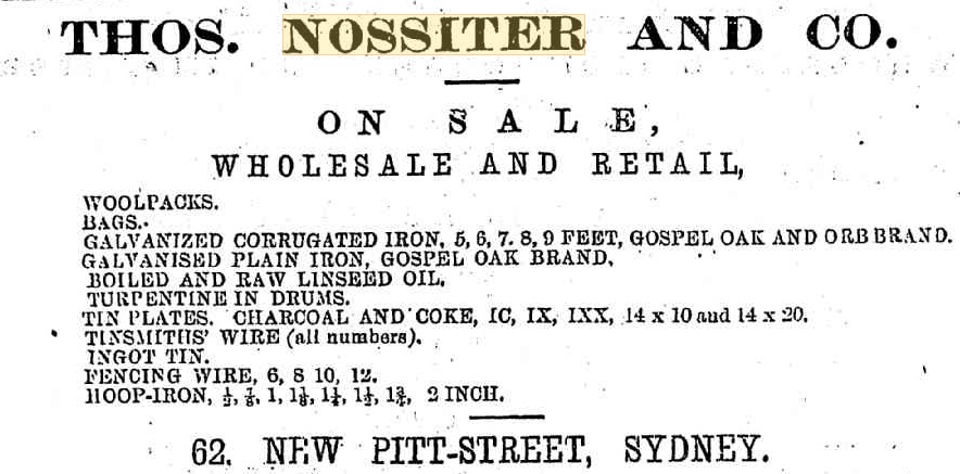 NOSSITER—July 12, Mrs. Thomas Nossiter, of a son. Family Notices (1875, August 6). The Sydney Morning Herald (NSW : 1842 - 1954), p. 3. Retrieved from http://nla.gov.au/nla.news-article13358449