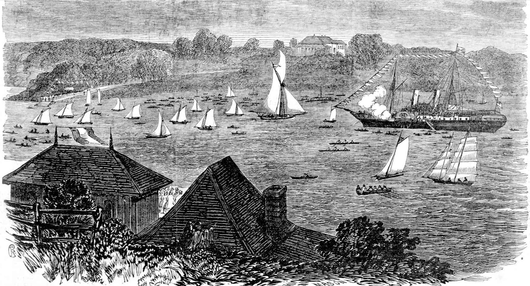 The somewhat secluded but romantic arm of Port Jackson known as Lane Cove River was yesterday the scene of an unusual, but extremely exhilarating gala. A number of the leading residents at Hunter's Hill, and on the river, having taken the matter in hand, and the able assistance of Mr. Jules Joubert, as director, having been obtained, an excellent boat-racing programme was the result. The neighbourhood supplied a large number of spectators, besides whom there were a great many picnic parties and visitors from town. The latter reached the spot under great difficulties, the miserable boats now running being quite inadequate in power, capacity, or convenience, for the evidently growing traffic between Sydney and the Hill, and it is a matter for gratulation that the new steamers recently launched by a local company will soon be running. On reaching the bend on the river, just beyond the Butcher's Block, it was evident that something out of the common was about to disturb the almost invariably placid waters in that locality. There were a good many sailing, and rowing boats, such as are usually seen on such occasions, and there were some peculiarly constructed canoes-something between a boot-trunk and a bass-viol case, the like of which was never seen afloat before; and, to crown all, there were about a dozen of young urchins engaged in the some- what difficult task of navigating washing tubs with paddles. It appeared to matter little to the paddlers whether they were in the tubs or in the water, and the rapidity with which they changed from the one to the other was startling to on-lookers of a less amphibious nature. Upon almost every grassy knoll within sight of the course there was a picnic party, and throughout all the races, as long as the competitors were within hail, the partisans of each crew encouraged their favourites in the most enthusiastic manner.