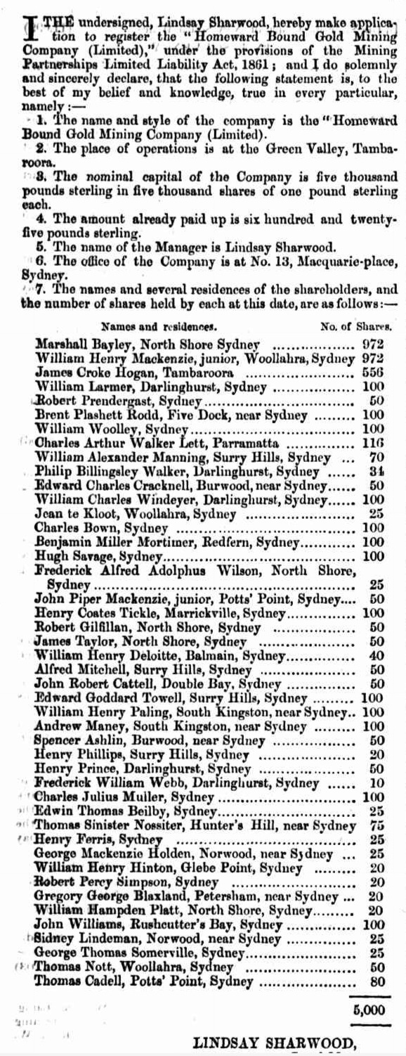 18 Jun 1872 - Government Gazette I THE undersigned, Lindsay Sharwood, hereby make application to register the “Homeward Bound Gold Mining - Trove