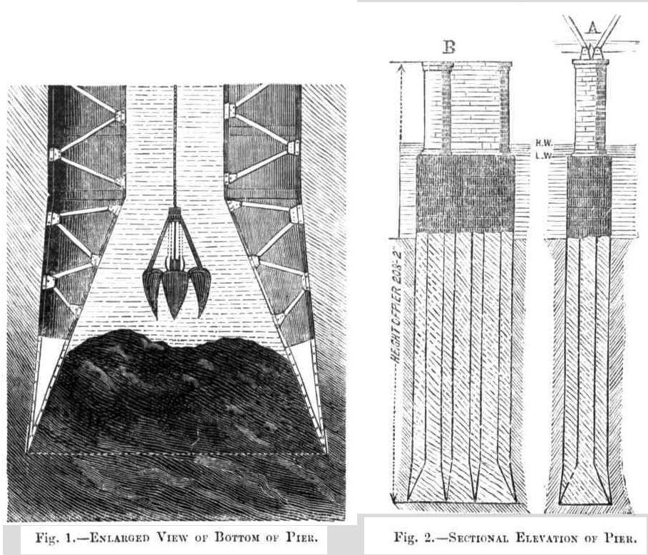 At the bottom of the caisson a 25ft high cutting edge dug into the silt on the river bed when bottom was reached. Tube caps were removed alternatively, so that a large grab, operated off a jib crane attached to a punt moored alongside the pier, could be dropped down the tubes and cut into the river bed, automatically closing as it was lifted, and dredging a hole for the caisson to settle. This was continued until the foundation was reached.