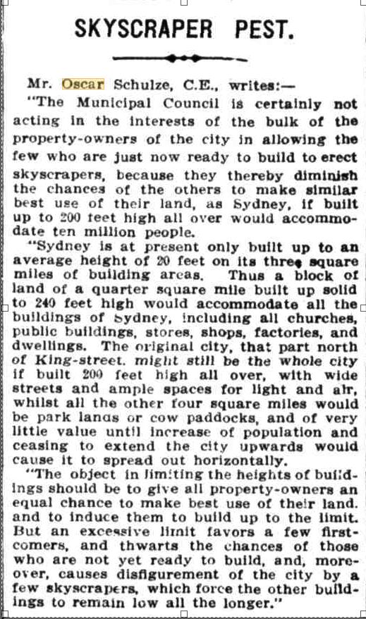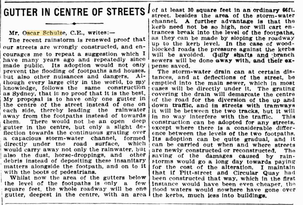 SCHULZE. — April 4, 1919, at his residence, Basing-stoke, Musgrave-street, Mosman, Carl Oscar Schulze, C.E., of pernicious anaemia, in his 71st year. Privately interred, April 5, at Gore Hill. Family Notices (1919, April 7). The Sydney Morning Herald (NSW : 1842 - 1954), , p. 6. Retrieved from http://nla.gov.au/nla.news-article15833137