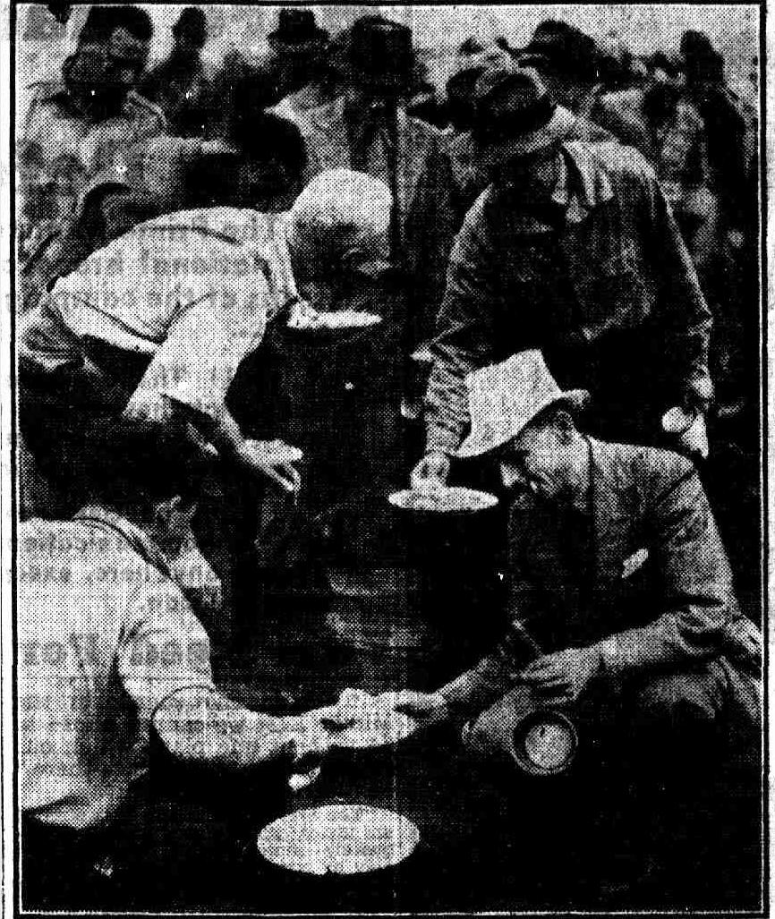HUNGRY MEN queue up for lunch after strenuous training at the Warriewood weekend camp of the 17th Battalion, Volunteer Defence Corps (Home Guard), where they were inspected yesterday by the State Commander of the V.D.C. (Major-General Fewtrell) and the Commander of the Sydney-Port Kembla Portress Area (Brigadier-General Heane). Army Stew Popular (1941, June 9). The Daily Telegraph (Sydney, NSW : 1931 - 1954), p. 6. Retrieved from http://nla.gov.au/nla.news-article248143380