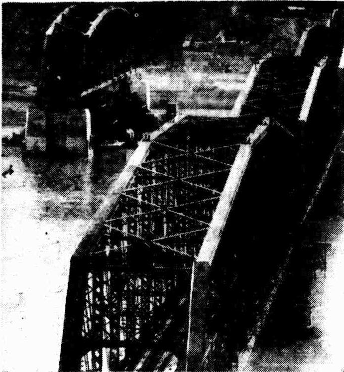 As each span was constructed on the ledge it had to be raised to pier level before the pontoons could be floated underneath to carry it away. To undertake this job two huge lifting jacks, each weighing 230 tons, and 52 feet high, were designed by young engineers-two were still studying for their diplomas--and these jacks lifted the spans 25ft in two and a half days.