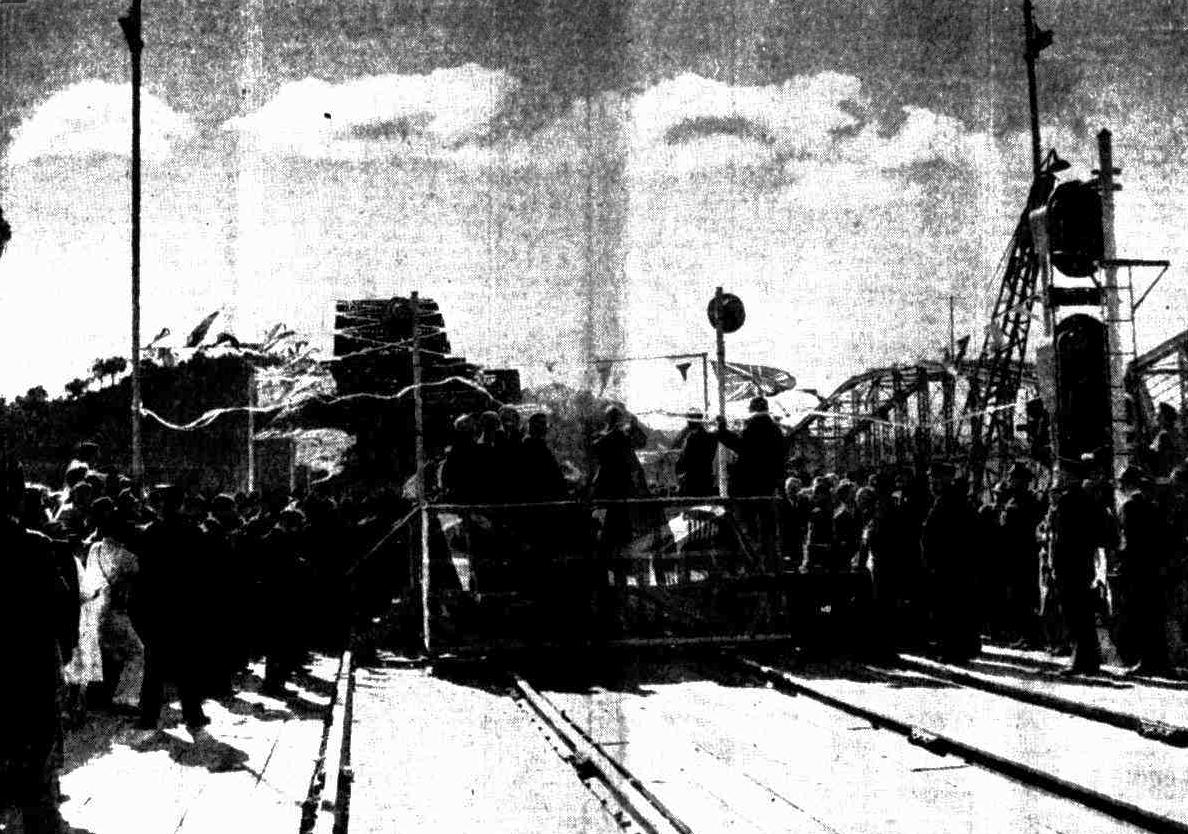Scene at the official opening of the new railway bridge over the Hawkesbury River. This bridge is now the main link between the northeastern and southeastern quarters of the continent. NEW RAILWAY BRIDGE OVER HAWKESBURY RIVER OPENED (1946, July 3). Daily Advertiser (Wagga Wagga, NSW : 1911 - 1954), p. 1. Retrieved from http://nla.gov.au/nla.news-article145135440